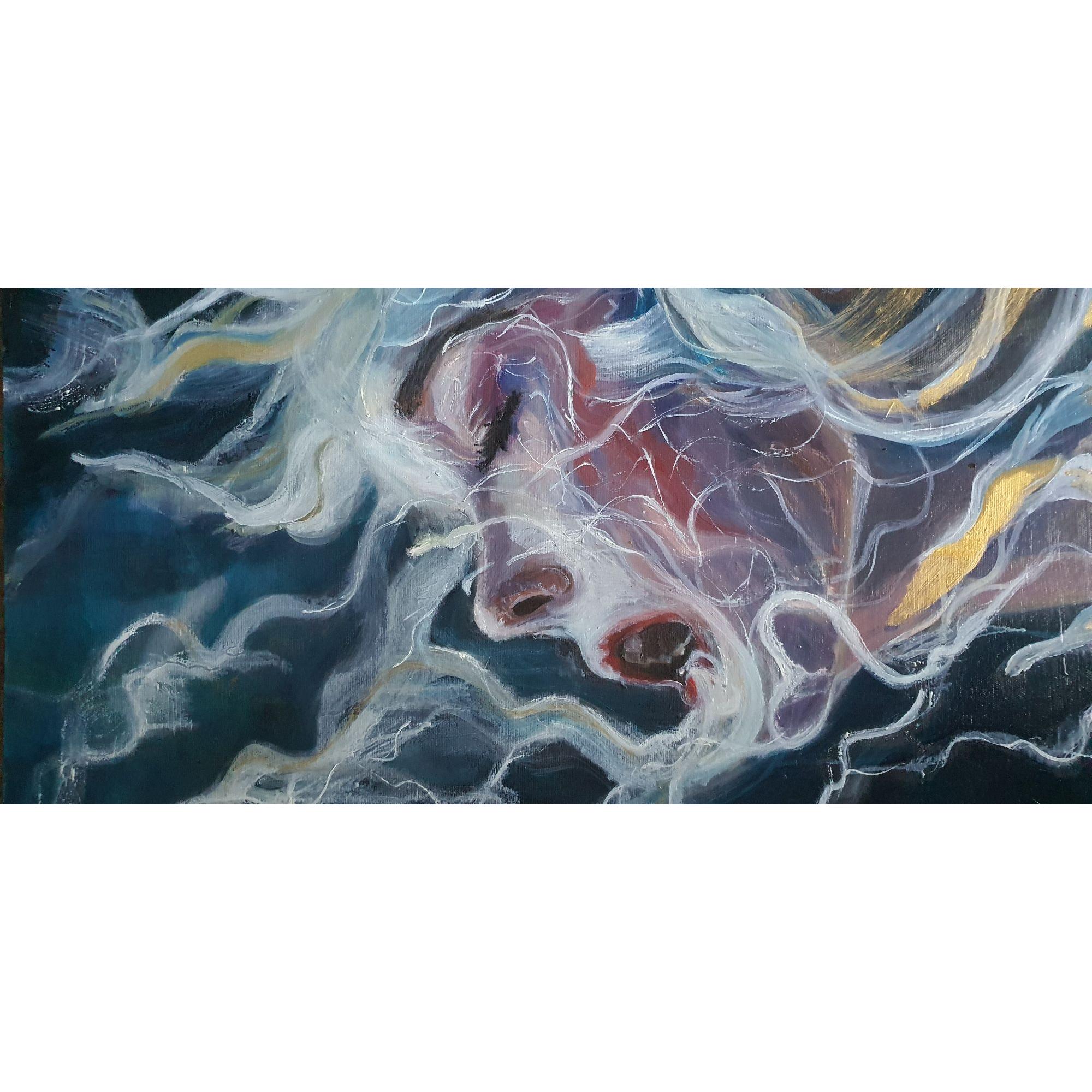 Vanishing è un’opera che esplora il confine sottile tra presenza e dissoluzione. Il dipinto ritrae un volto colto in un momento di sospensione emotiva: la testa reclinata all’indietro, la bocca socchiusa e l’espressione intensa suggeriscono un passaggio interiore, un atto di abbandono o trasformazione.