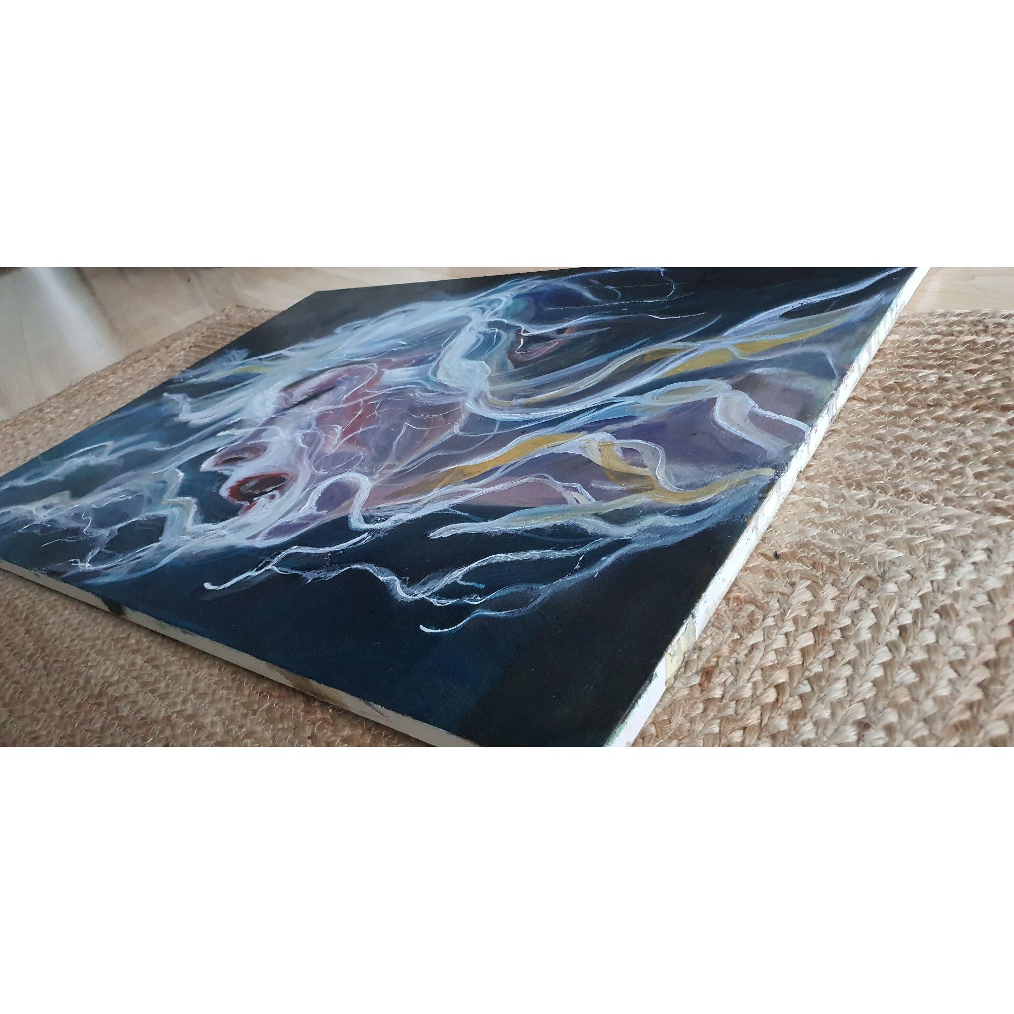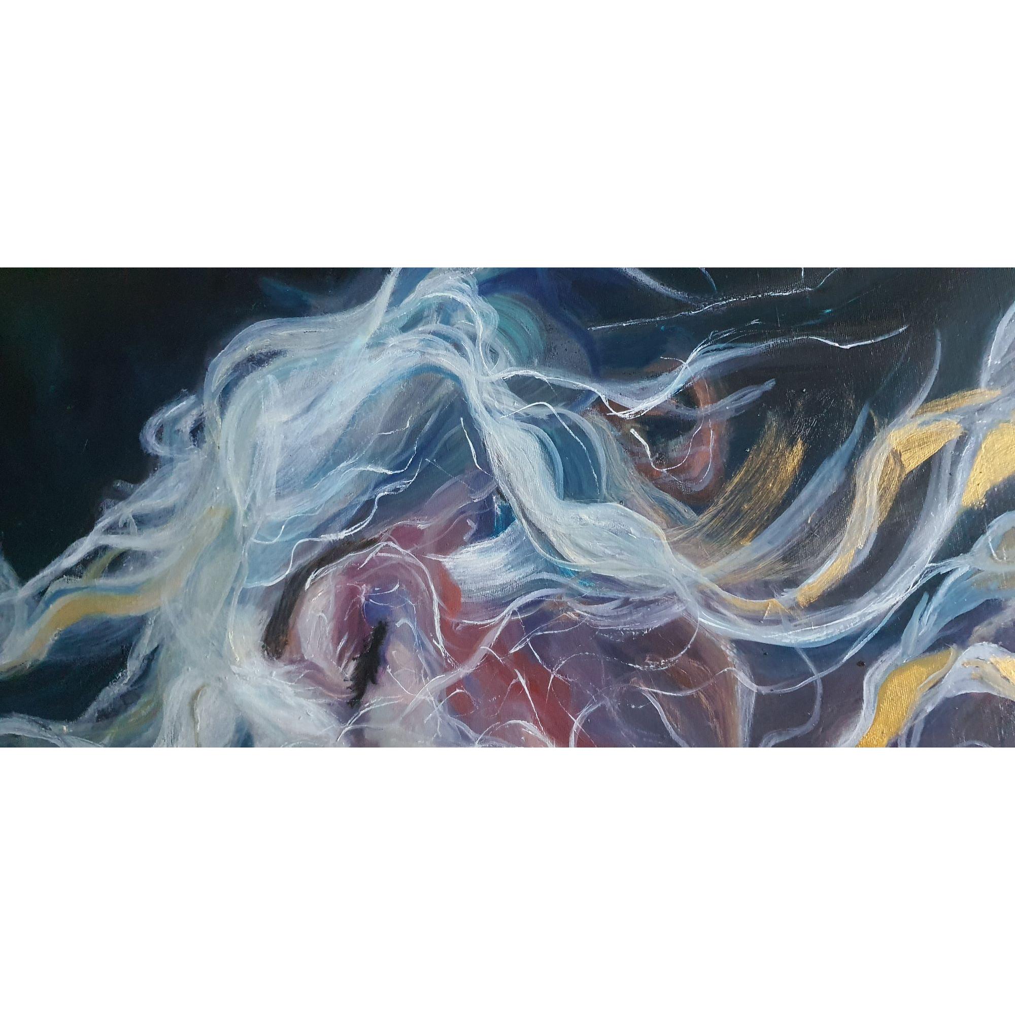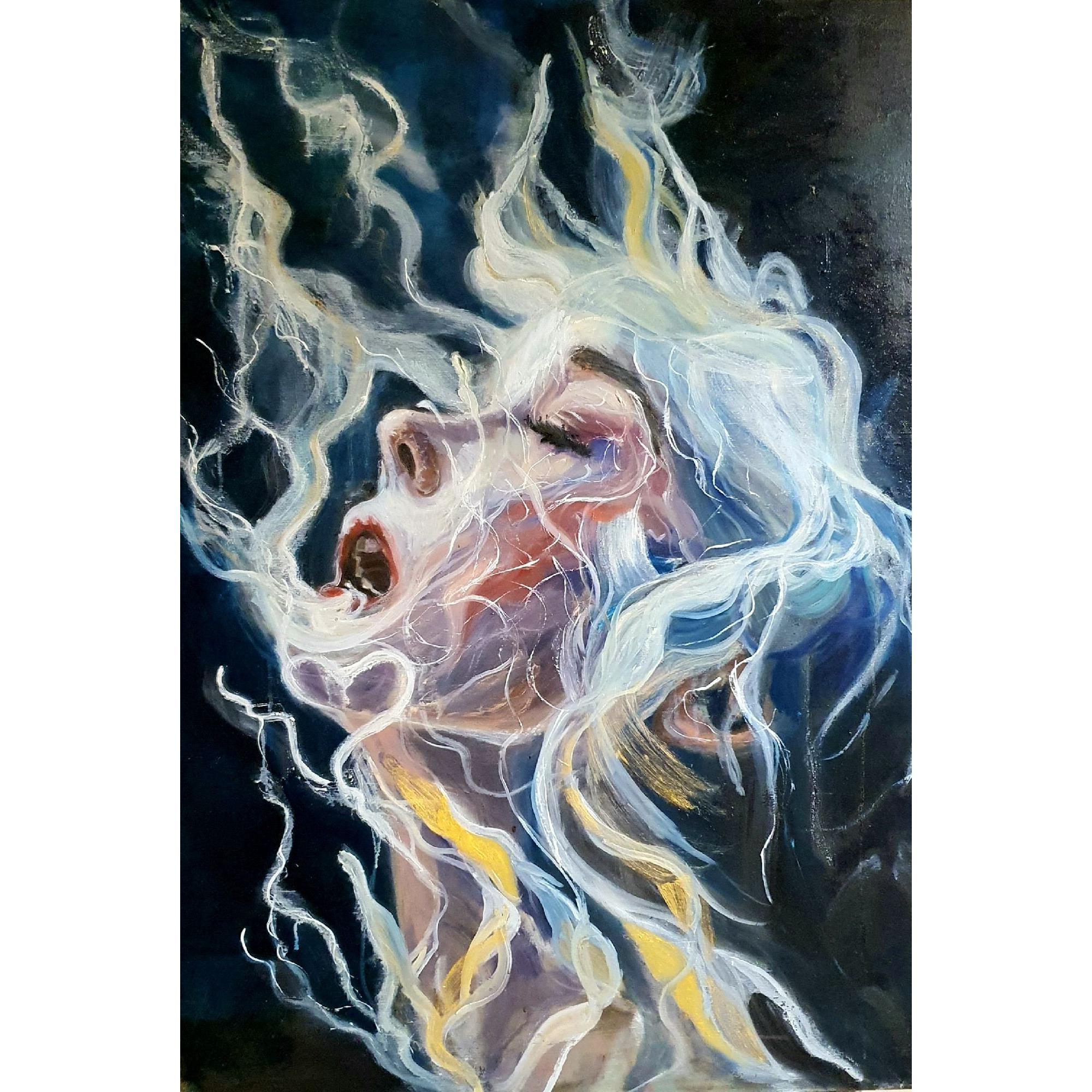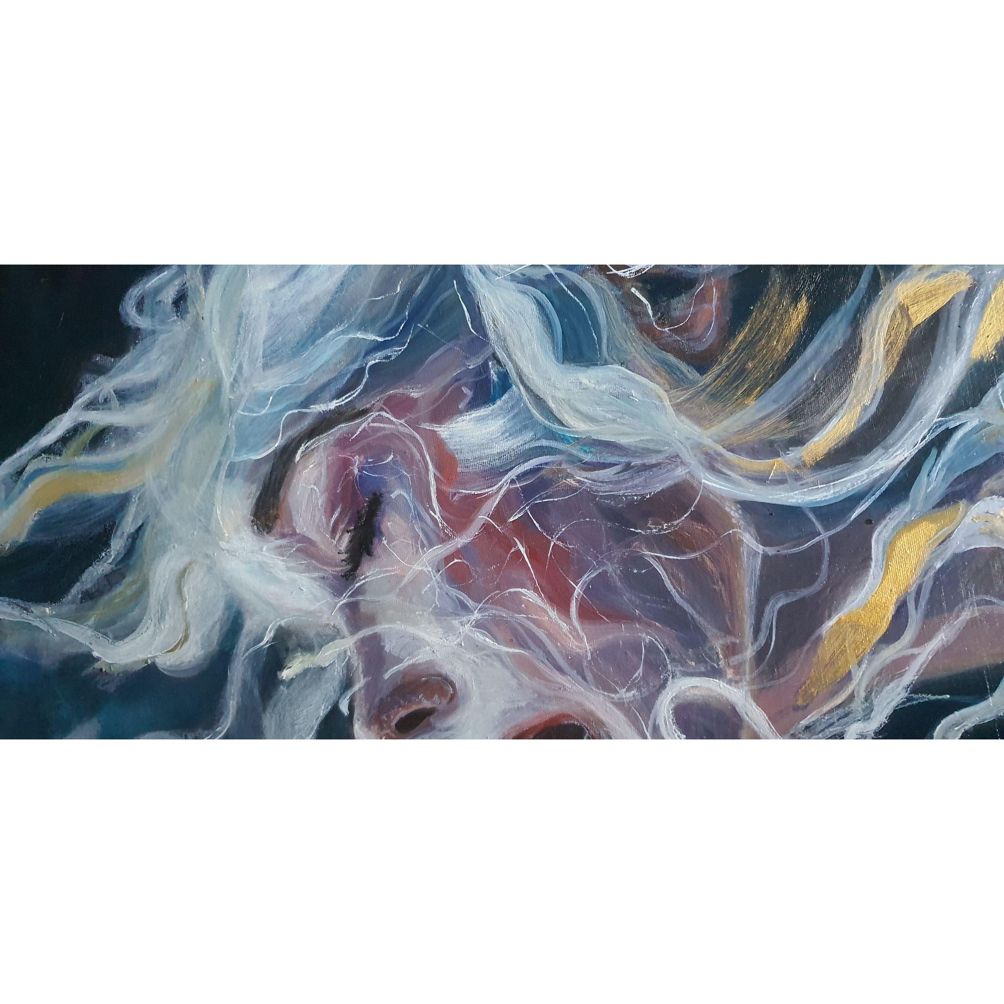 La figura emerge da un fondo scuro che ne esalta la luminosità, mentre i capelli si espandono in linee fluide e filamenti luminosi che sembrano dissolversi nell’aria. Le pennellate sono dinamiche, stratificate, e creano un movimento quasi organico, come se la materia si stesse trasformando in energia. I toni rosati, blu e violacei modellano la pelle, mentre accenti bianchi e gialli suggeriscono un’illuminazione “interna”, una vibrazione che attraversa il volto.