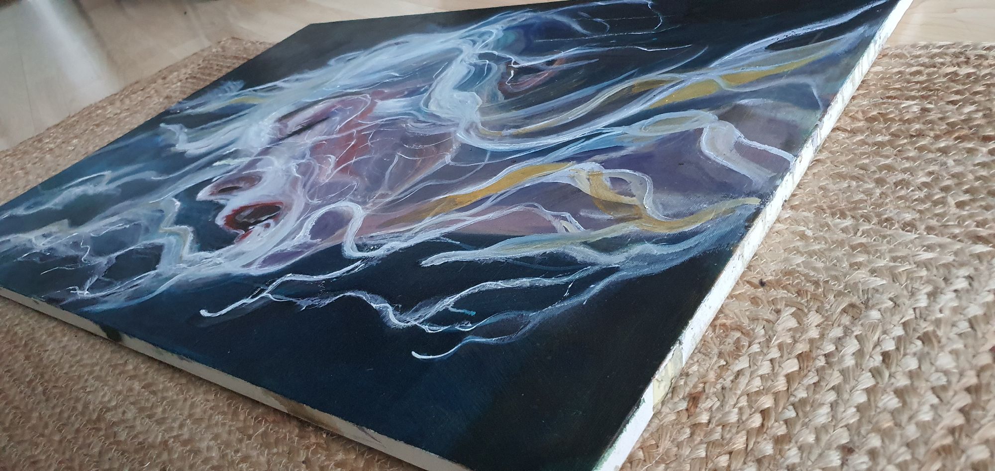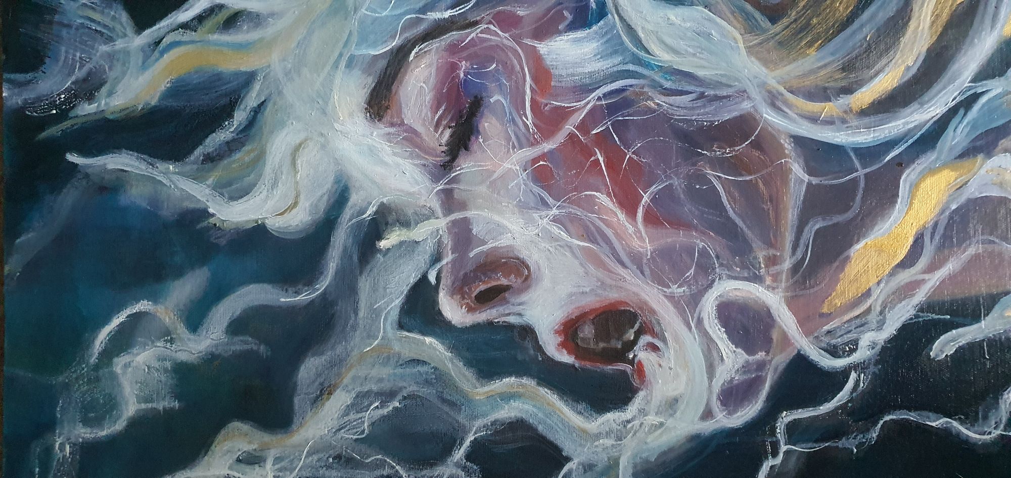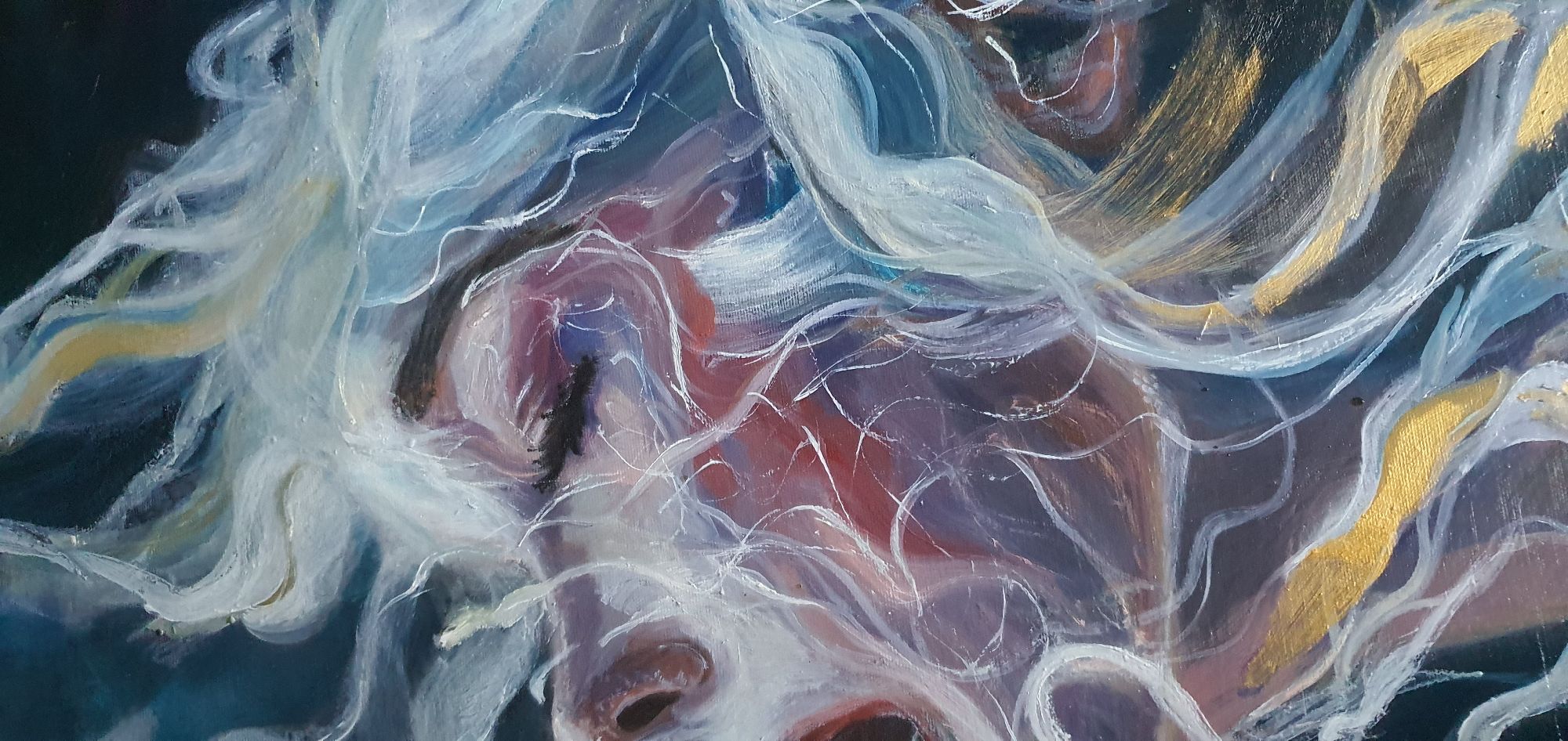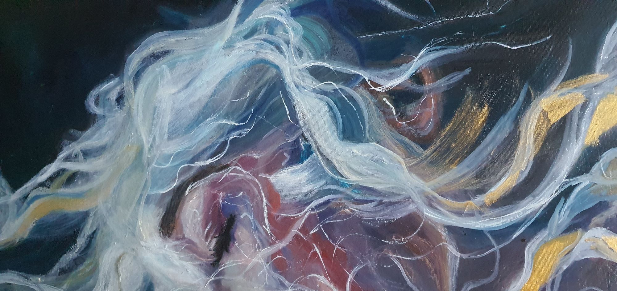 La figura emerge da un fondo scuro che ne esalta la luminosità, mentre i capelli si espandono in linee fluide e filamenti luminosi che sembrano dissolversi nell’aria. Le pennellate sono dinamiche, stratificate, e creano un movimento quasi organico, come se la materia si stesse trasformando in energia. I toni rosati, blu e violacei modellano la pelle, mentre accenti bianchi e gialli suggeriscono un’illuminazione “interna”, una vibrazione che attraversa il volto.
