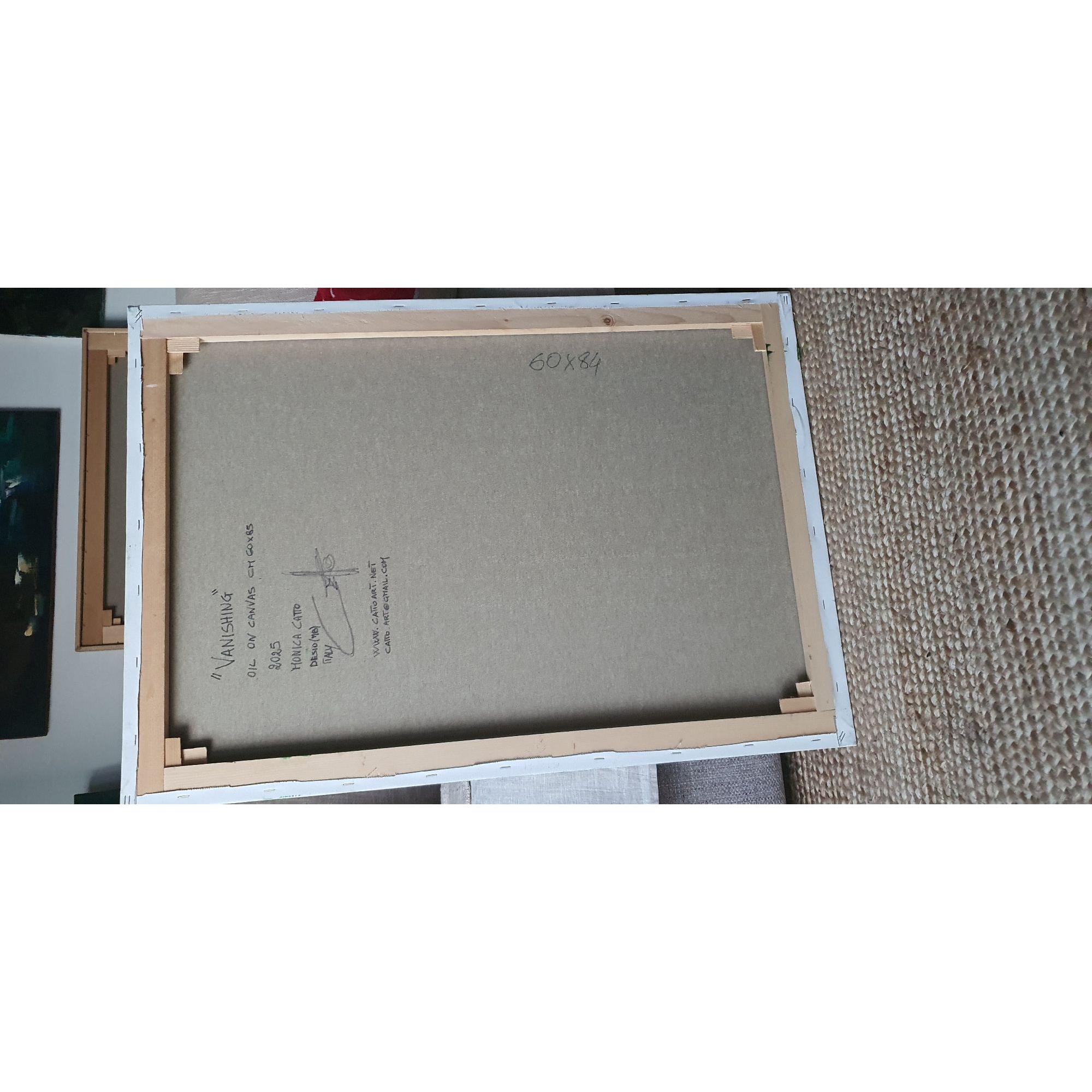 L’opera gioca sulla soglia tra figurazione e astrazione: la figura è riconoscibile, ma i suoi contorni si sfaldano, lasciando spazio a un senso di metamorfosi. Vanishing parla di identità che si evolve, di parti di sé che si dissolvono per lasciare spazio a qualcosa di nuovo. È un’immagine che non rappresenta la scomparsa come perdita, ma come transizione.