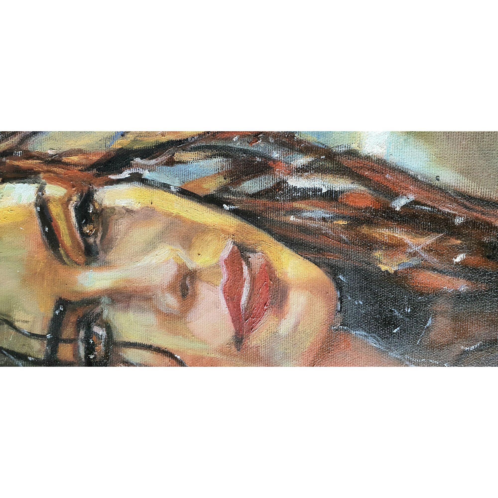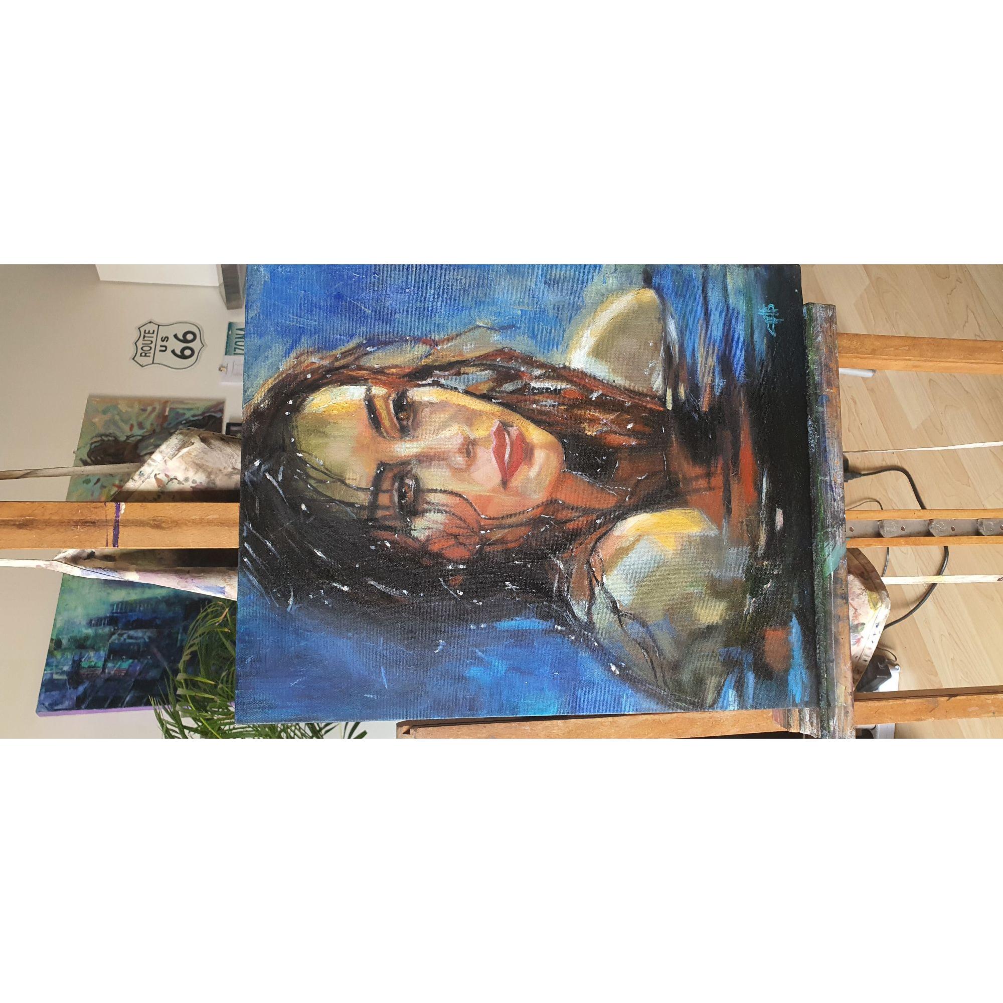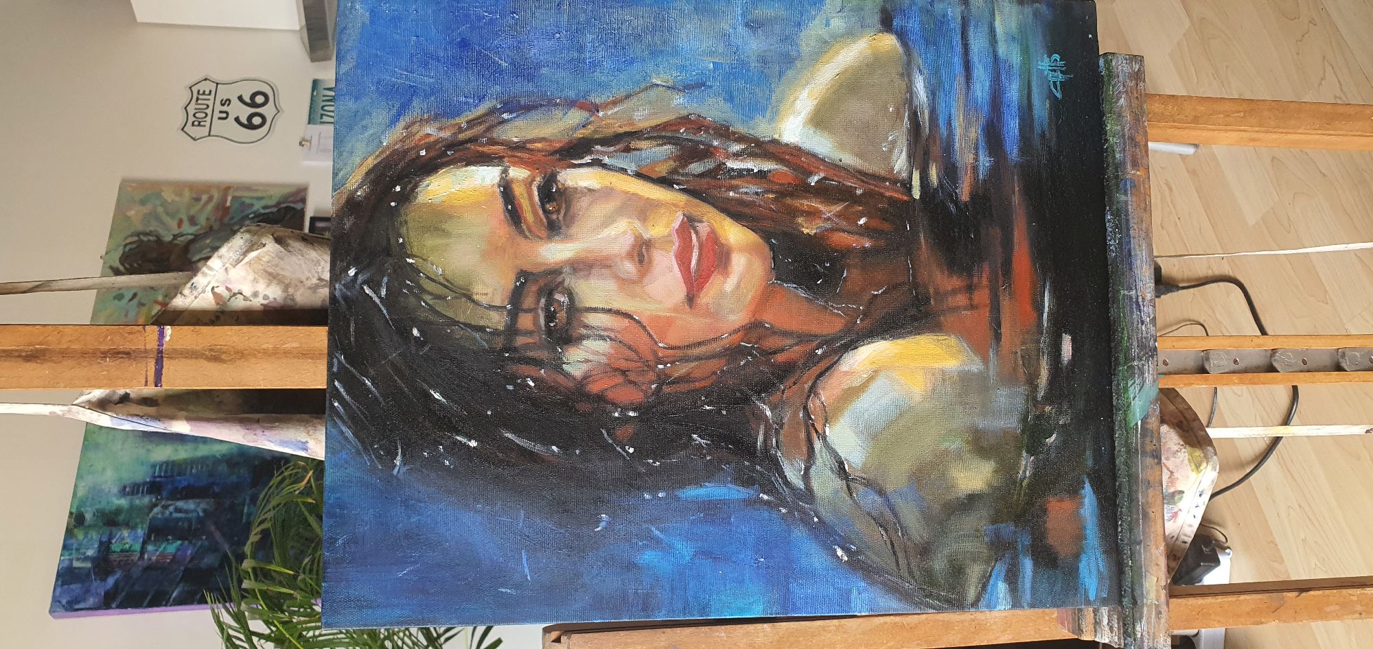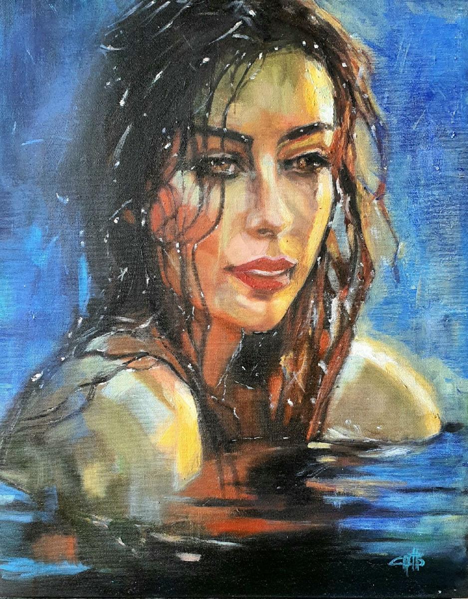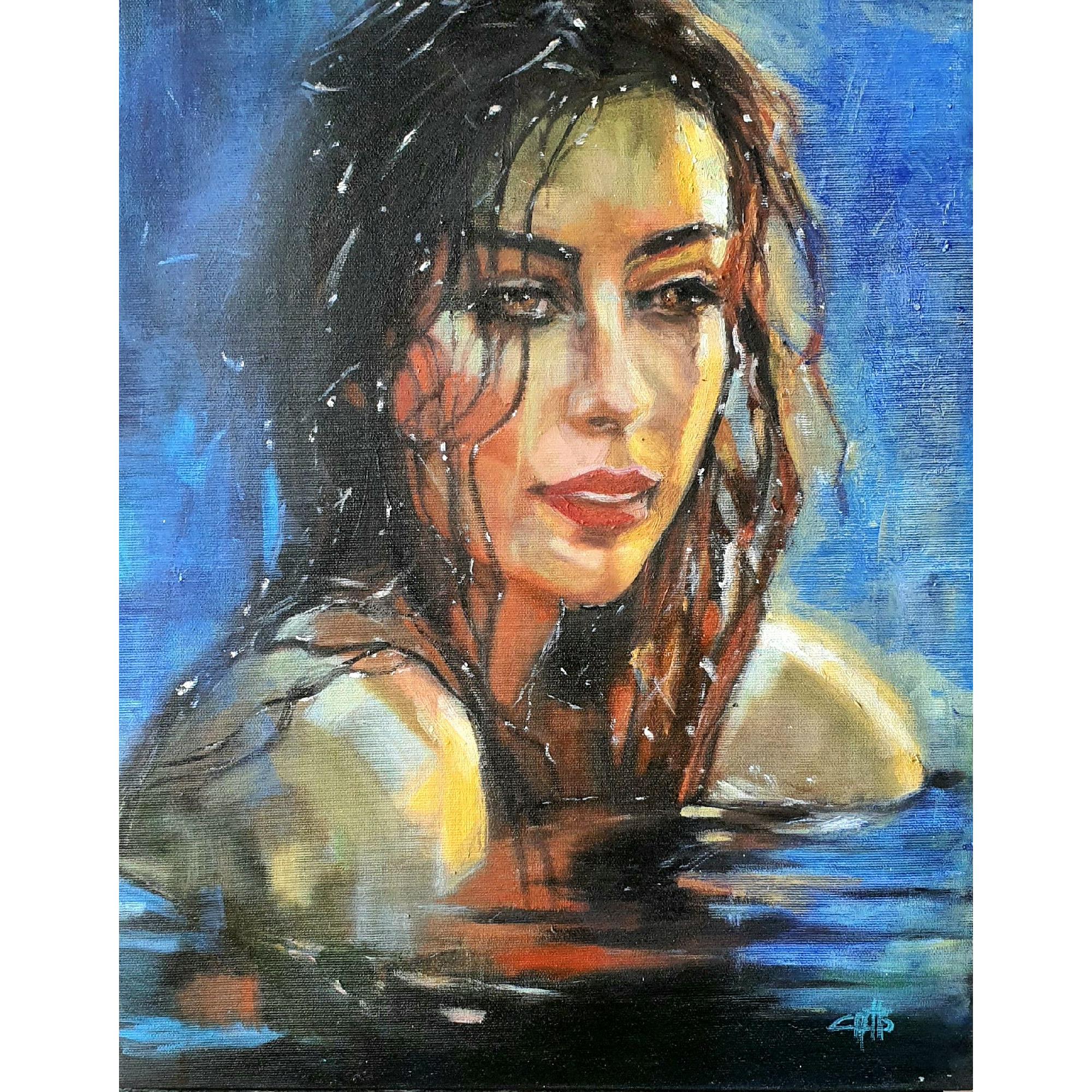 Questo dipinto originale appartiene a una ricerca pittorica dedicata alla figura femminile nell’acqua, un tema centrale nella mia pratica artistica contemporanea, dove il ritratto si trasforma in esperienza sensoriale ed emotiva. La protagonista emerge dalla superficie liquida in uno stato di sospensione, tra presenza e dissolvenza. L’acqua non è semplice elemento narrativo, ma spazio psicologico: riflette, avvolge e frammenta la percezione, amplificando l’intensità dello sguardo e la dimensione interiore del soggetto. La pittura si sviluppa attraverso una tecnica mista di acrilico, olio e cold wax su tela, con un approccio stratificato che alterna velature trasparenti e interventi gestuali più materici. I contrasti tra toni caldi incarnati e profondità cromatiche blu costruiscono una tensione visiva sofisticata, mentre colature e riflessi introducono un senso di movimento continuo e vibrazione luminosa. Inserita nel contesto dell’arte contemporanea figurativa, l’opera dialoga con la tradizione del ritratto reinterpretandola in chiave attuale, con un linguaggio pittorico che privilegia atmosfera, luce e materia. Questo lavoro è destinato a collezionisti attenti alla qualità pittorica e alla ricerca estetica, alla ricerca di un ritratto contemporaneo femminile capace di coniugare eleganza, intensità emotiva e forte identità visiva. Un’opera unica, pensata per collezioni d’arte e spazi di rappresentanza, dove possa esprimere pienamente la propria presenza.