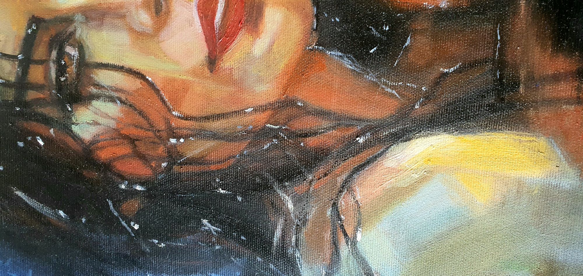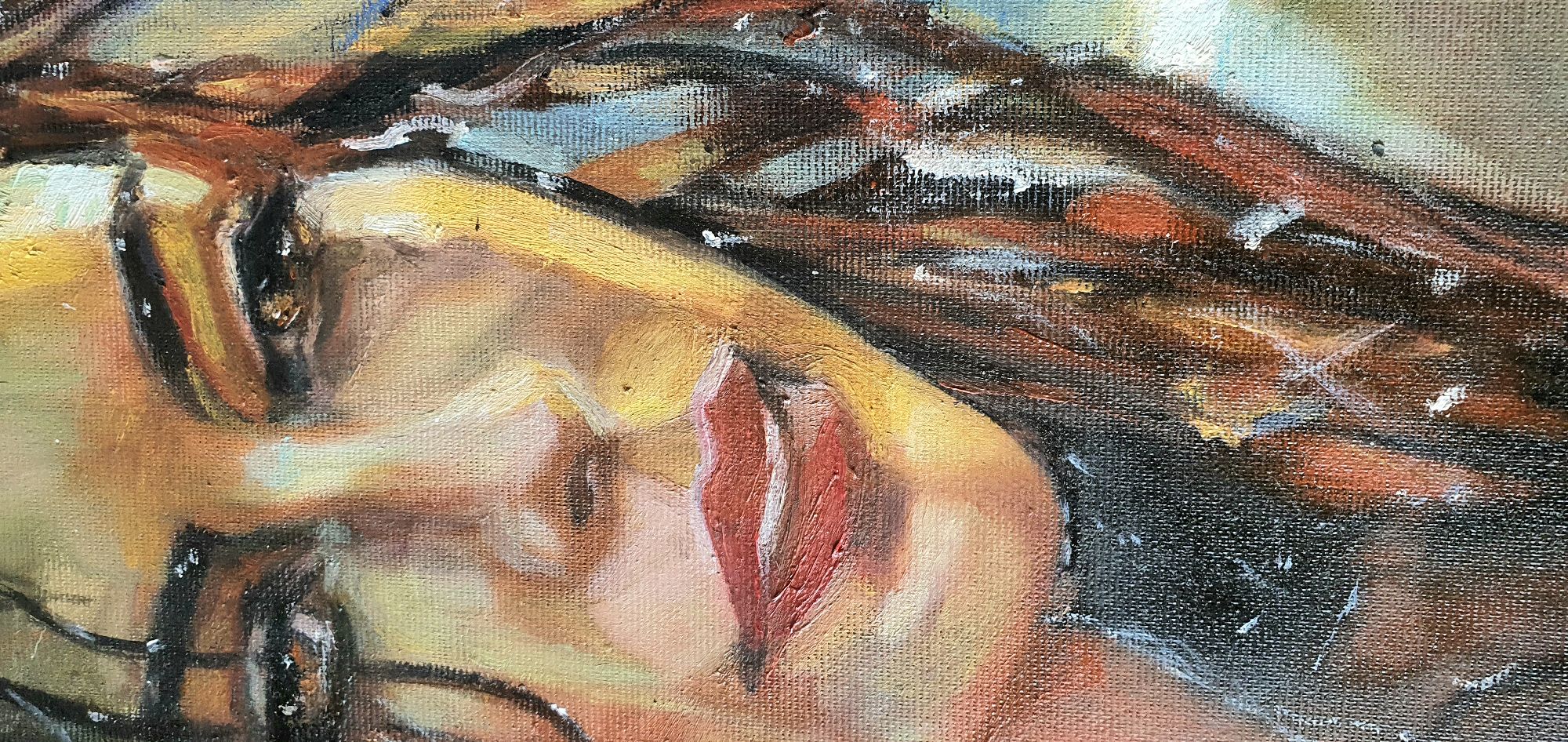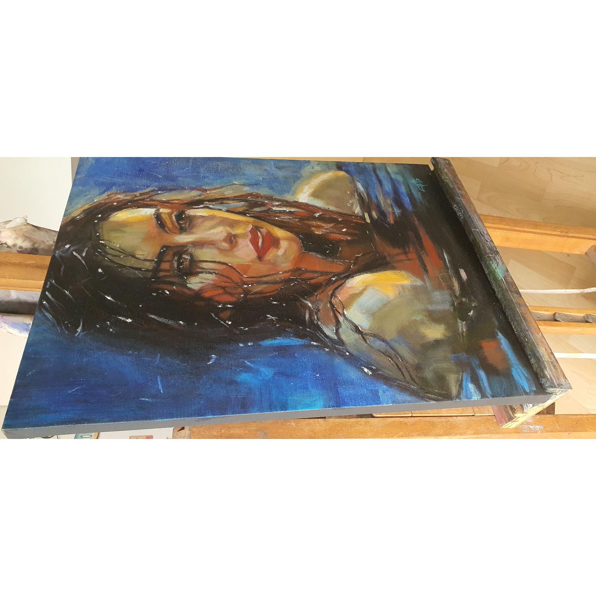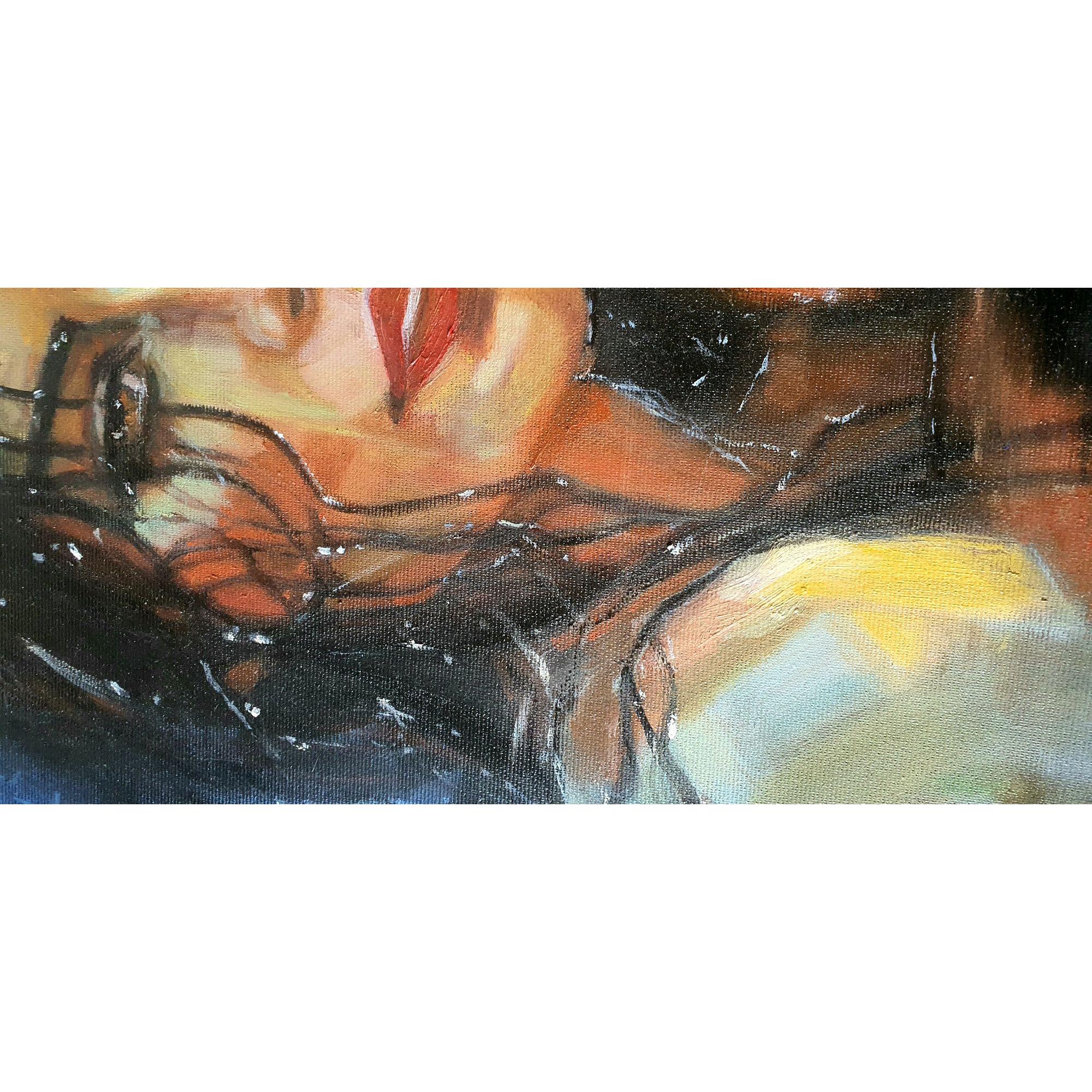Questo dipinto originale appartiene a una ricerca pittorica dedicata alla figura femminile nell’acqua, un tema centrale nella mia pratica artistica contemporanea, dove il ritratto si trasforma in esperienza sensoriale ed emotiva. La protagonista emerge dalla superficie liquida in uno stato di sospensione, tra presenza e dissolvenza. L’acqua non è semplice elemento narrativo, ma spazio psicologico: riflette, avvolge e frammenta la percezione, amplificando l’intensità dello sguardo e la dimensione interiore del soggetto. La pittura si sviluppa attraverso una tecnica mista di acrilico, olio e cold wax su tela, con un approccio stratificato che alterna velature trasparenti e interventi gestuali più materici. I contrasti tra toni caldi incarnati e profondità cromatiche blu costruiscono una tensione visiva sofisticata, mentre colature e riflessi introducono un senso di movimento continuo e vibrazione luminosa. Inserita nel contesto dell’arte contemporanea figurativa, l’opera dialoga con la tradizione del ritratto reinterpretandola in chiave attuale, con un linguaggio pittorico che privilegia atmosfera, luce e materia. Questo lavoro è destinato a collezionisti attenti alla qualità pittorica e alla ricerca estetica, alla ricerca di un ritratto contemporaneo femminile capace di coniugare eleganza, intensità emotiva e forte identità visiva. Un’opera unica, pensata per collezioni d’arte e spazi di rappresentanza, dove possa esprimere pienamente la propria presenza.