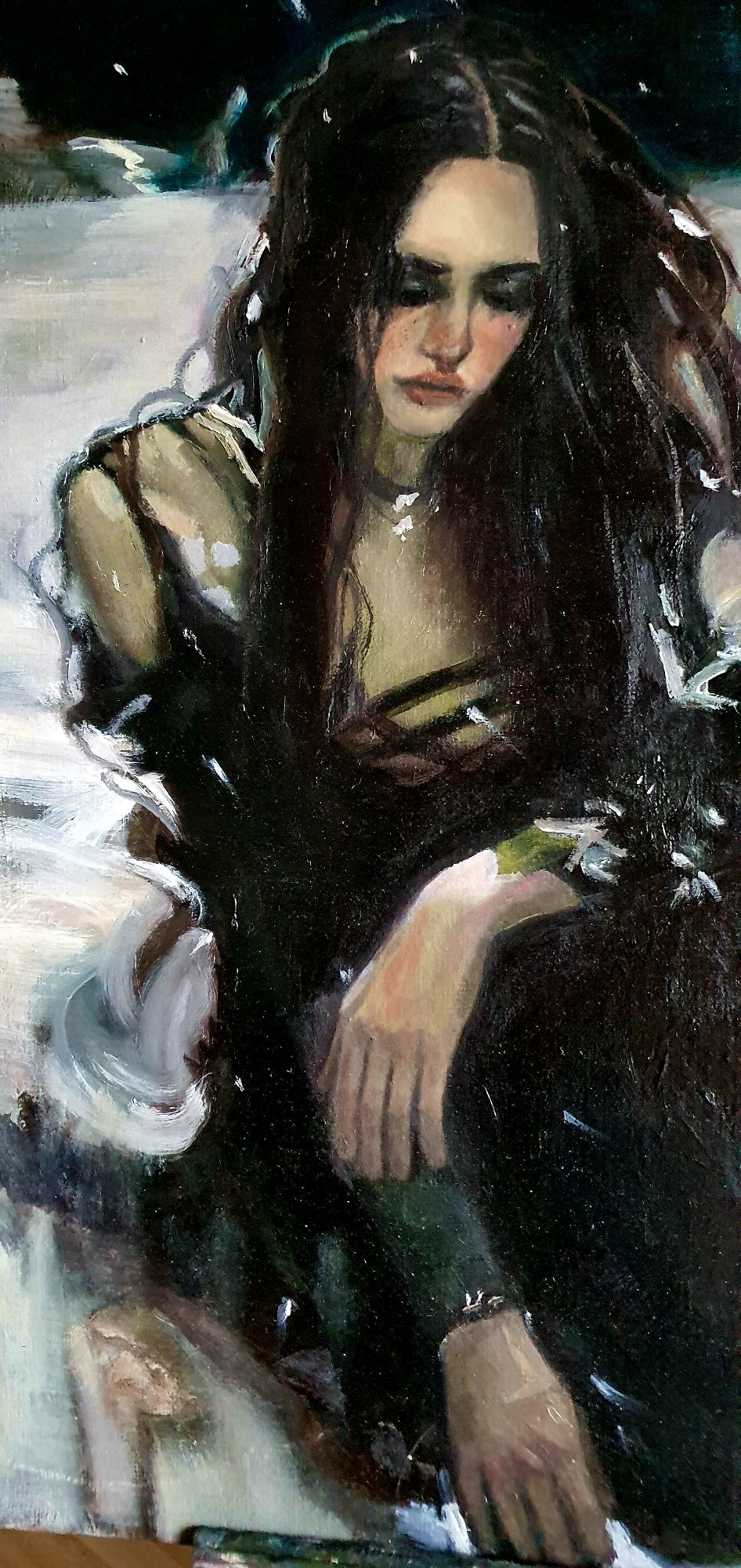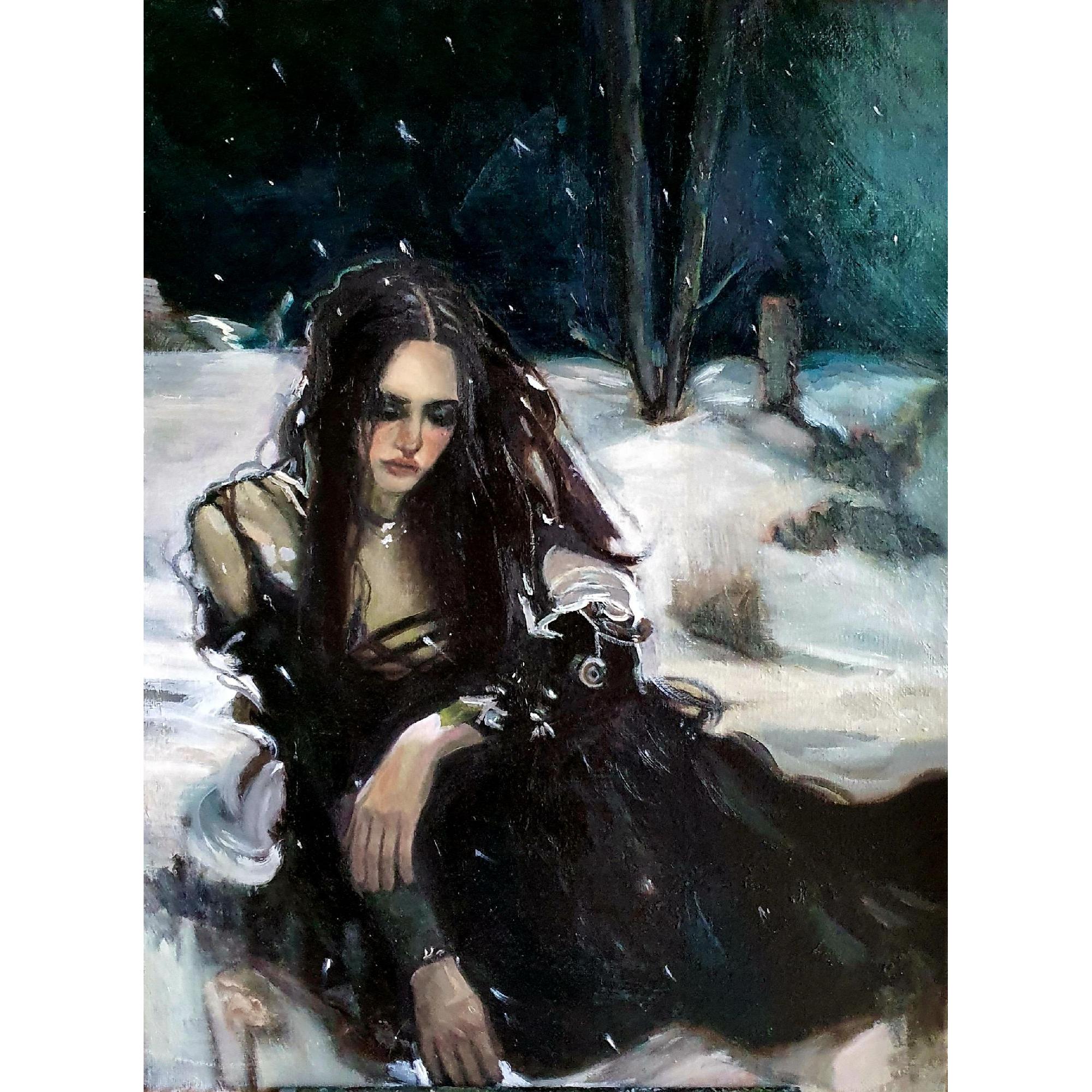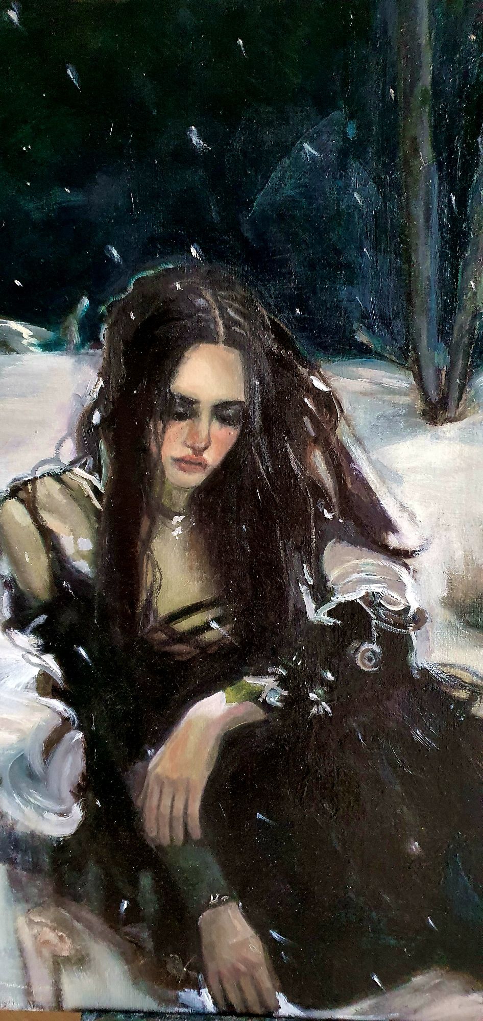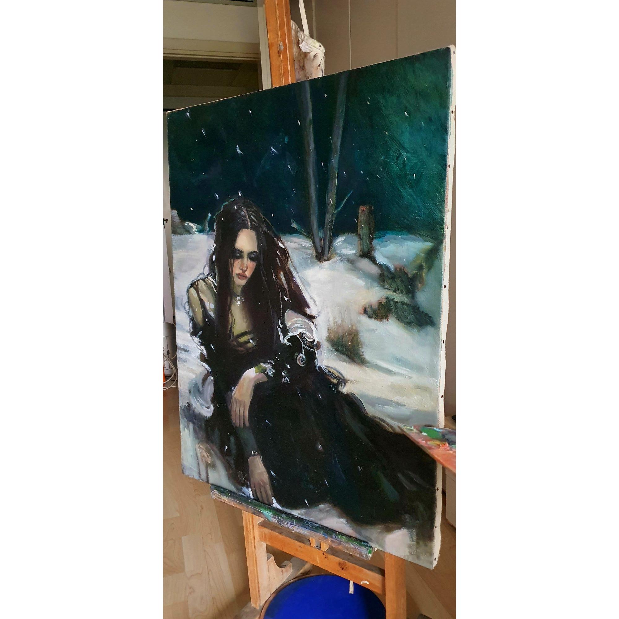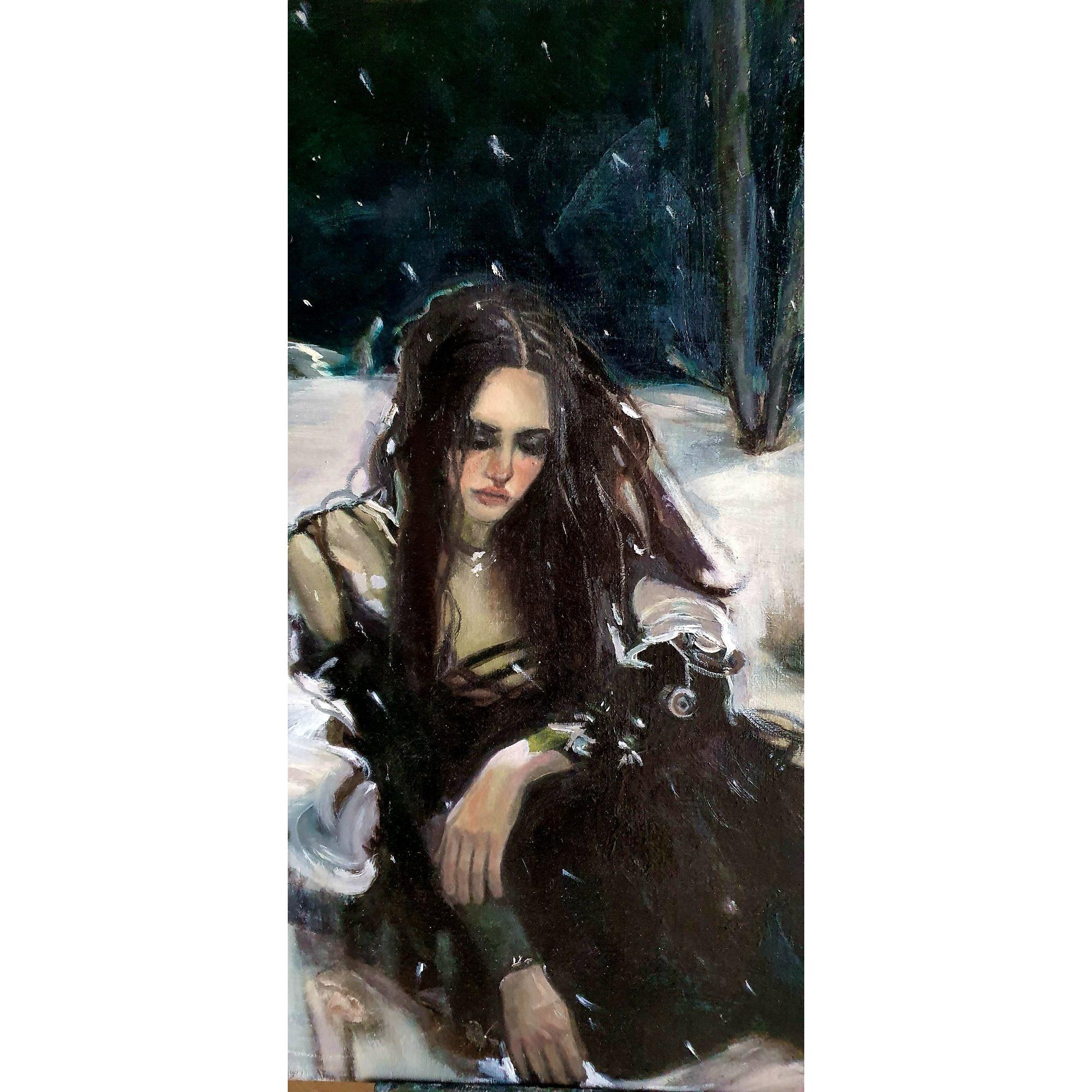 Nel mio lavoro torno spesso a quel punto fragile in cui la figura si dissolve e resta soltanto l’emozione. La stagione del silenzio nasce da uno spazio interiore sospeso, dove il tempo si rarefà e ogni elemento perde definizione per diventare percezione.La figura femminile non è un ritratto, ma una soglia. Il suo sguardo abbassato, il corpo raccolto, parlano di una condizione trattenuta, intima, quasi in ascolto. Il paesaggio innevato non descrive un luogo reale: è uno spazio mentale, un vuoto silenzioso che accoglie e amplifica la presenza.Il vestito, scuro e fluido, si espande fino a confondersi con l’ambiente, diventando esso stesso materia emotiva. Non è solo un elemento formale, ma una prosecuzione del corpo, una zona d’ombra che avvolge e protegge, ma allo stesso tempo assorbe. Mi interessa quel momento in cui figura e contesto smettono di essere separati.La pittura resta aperta, vibrante, volutamente instabile. Lascio che il gesto emerga, che alcune parti rimangano sospese tra apparizione e dissolvenza. La finitura a cera fredda interviene proprio qui: opacizza la superficie, trattiene la luce, crea una pelle pittorica vellutata e profonda, che invita a uno sguardo ravvicinato.Questo lavoro non cerca una narrazione, ma una condizione. È un invito al silenzio come spazio pieno, denso, in cui l’immagine non si impone ma si rivela lentamente.