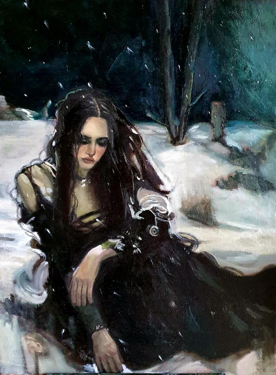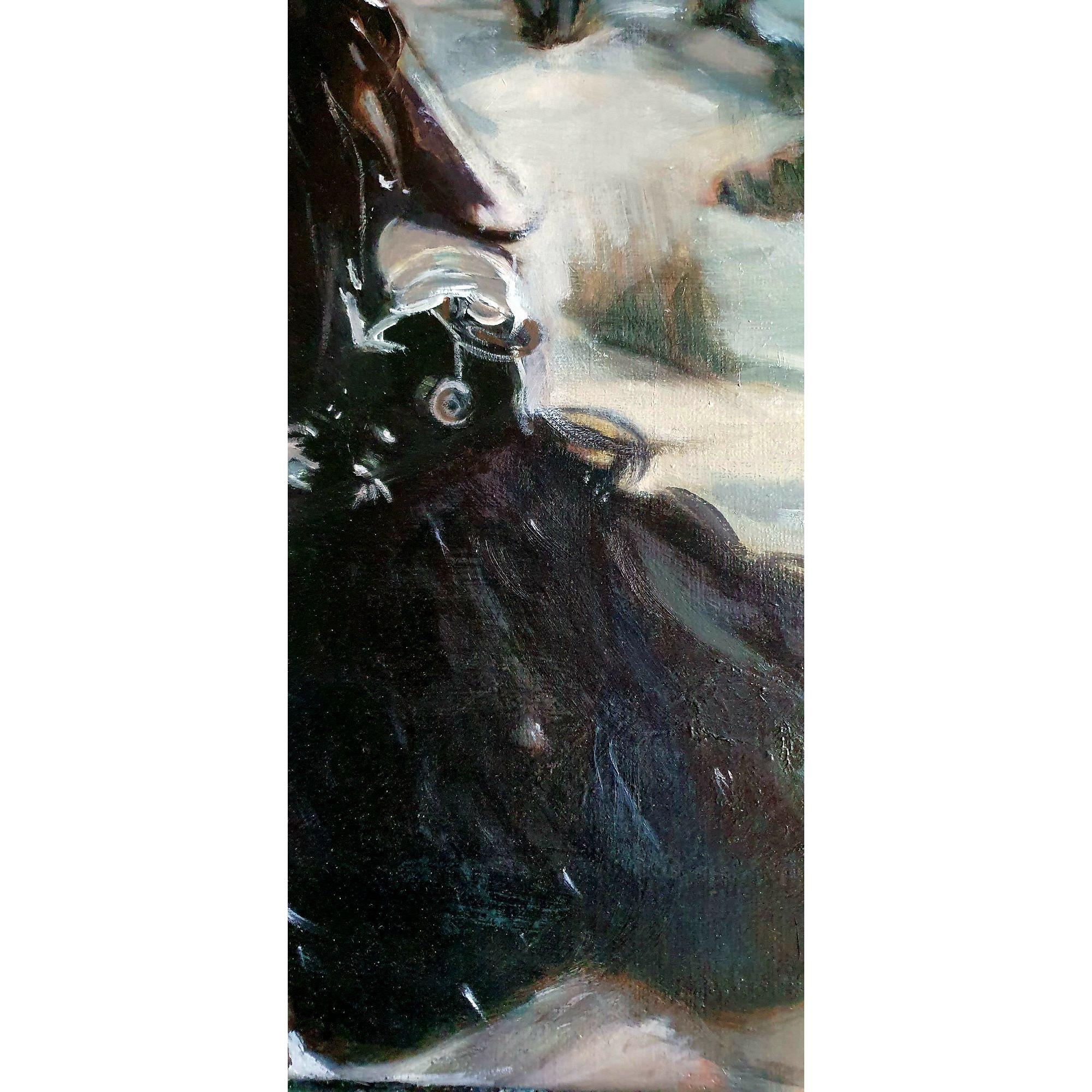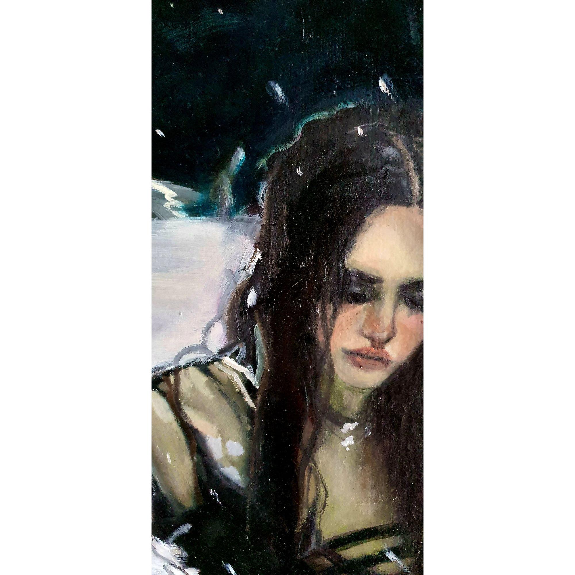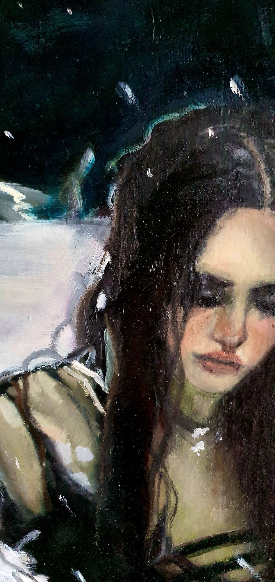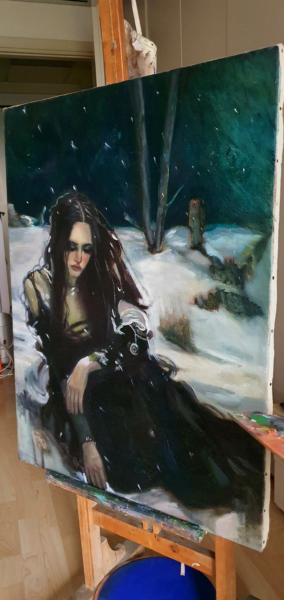 Nel mio lavoro torno spesso a quel punto fragile in cui la figura si dissolve e resta soltanto l’emozione. La stagione del silenzio nasce da uno spazio interiore sospeso, dove il tempo si rarefà e ogni elemento perde definizione per diventare percezione.La figura femminile non è un ritratto, ma una soglia. Il suo sguardo abbassato, il corpo raccolto, parlano di una condizione trattenuta, intima, quasi in ascolto. Il paesaggio innevato non descrive un luogo reale: è uno spazio mentale, un vuoto silenzioso che accoglie e amplifica la presenza.Il vestito, scuro e fluido, si espande fino a confondersi con l’ambiente, diventando esso stesso materia emotiva. Non è solo un elemento formale, ma una prosecuzione del corpo, una zona d’ombra che avvolge e protegge, ma allo stesso tempo assorbe. Mi interessa quel momento in cui figura e contesto smettono di essere separati.La pittura resta aperta, vibrante, volutamente instabile. Lascio che il gesto emerga, che alcune parti rimangano sospese tra apparizione e dissolvenza. La finitura a cera fredda interviene proprio qui: opacizza la superficie, trattiene la luce, crea una pelle pittorica vellutata e profonda, che invita a uno sguardo ravvicinato.Questo lavoro non cerca una narrazione, ma una condizione. È un invito al silenzio come spazio pieno, denso, in cui l’immagine non si impone ma si rivela lentamente.