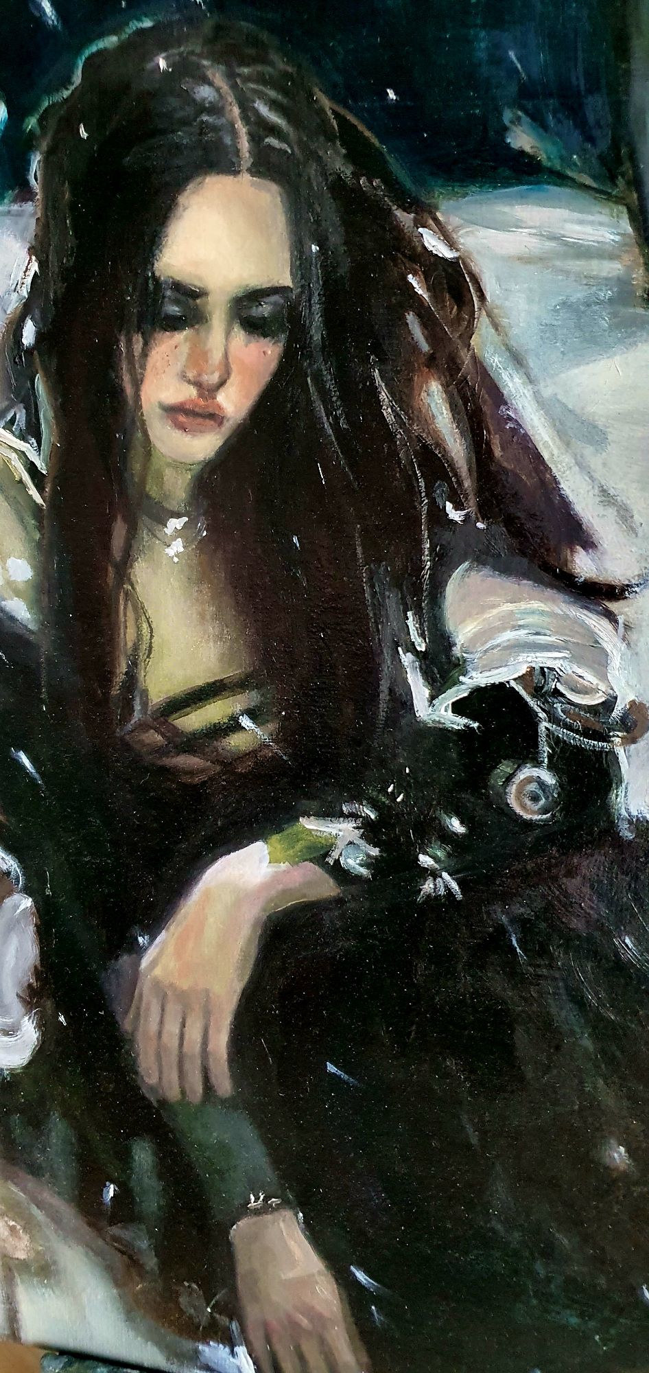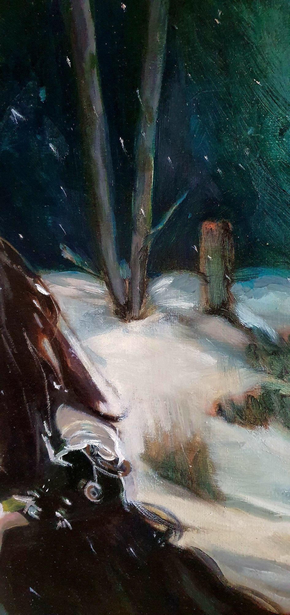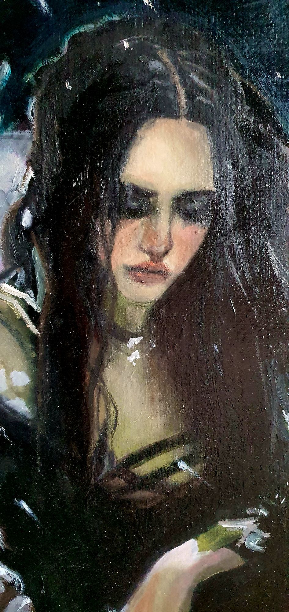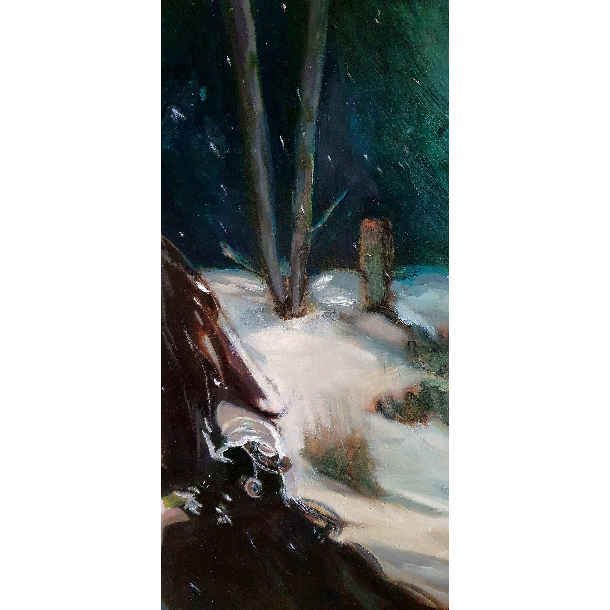 Nel mio lavoro torno spesso a quel punto fragile in cui la figura si dissolve e resta soltanto l’emozione. La stagione del silenzio nasce da uno spazio interiore sospeso, dove il tempo si rarefà e ogni elemento perde definizione per diventare percezione.La figura femminile non è un ritratto, ma una soglia. Il suo sguardo abbassato, il corpo raccolto, parlano di una condizione trattenuta, intima, quasi in ascolto. Il paesaggio innevato non descrive un luogo reale: è uno spazio mentale, un vuoto silenzioso che accoglie e amplifica la presenza.Il vestito, scuro e fluido, si espande fino a confondersi con l’ambiente, diventando esso stesso materia emotiva. Non è solo un elemento formale, ma una prosecuzione del corpo, una zona d’ombra che avvolge e protegge, ma allo stesso tempo assorbe. Mi interessa quel momento in cui figura e contesto smettono di essere separati.La pittura resta aperta, vibrante, volutamente instabile. Lascio che il gesto emerga, che alcune parti rimangano sospese tra apparizione e dissolvenza. La finitura a cera fredda interviene proprio qui: opacizza la superficie, trattiene la luce, crea una pelle pittorica vellutata e profonda, che invita a uno sguardo ravvicinato.Questo lavoro non cerca una narrazione, ma una condizione. È un invito al silenzio come spazio pieno, denso, in cui l’immagine non si impone ma si rivela lentamente.