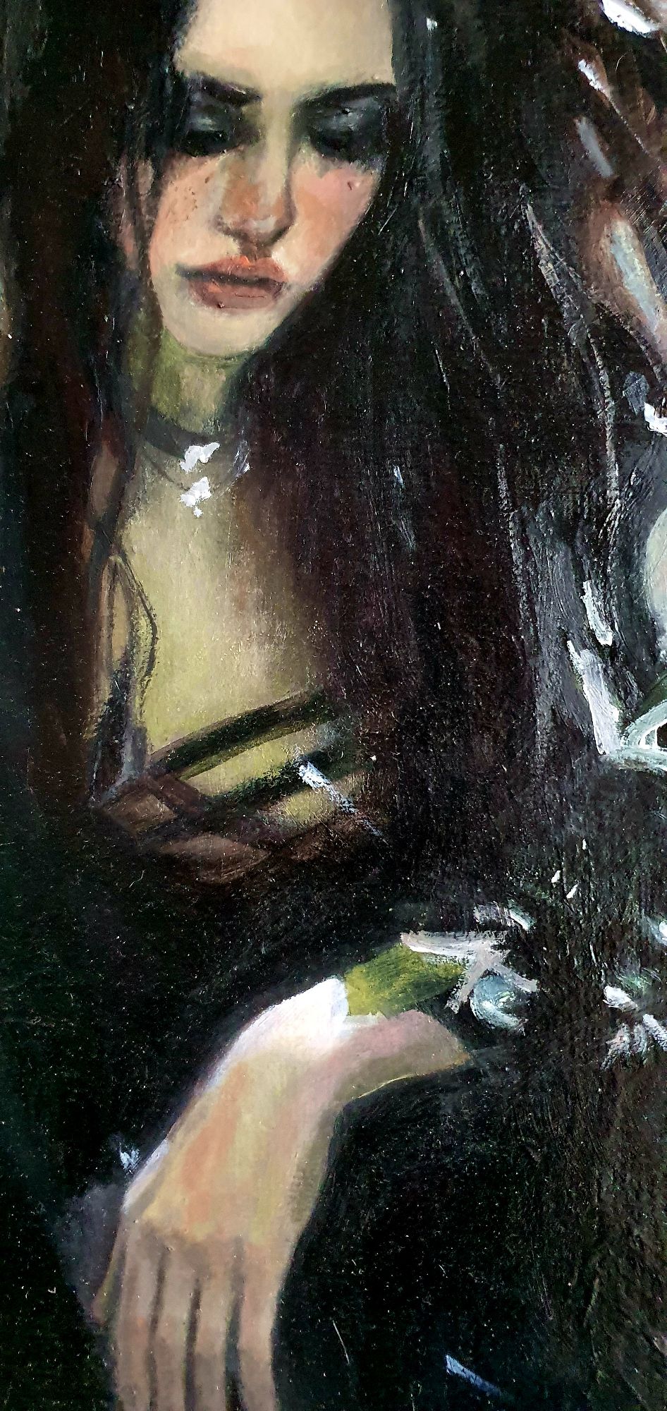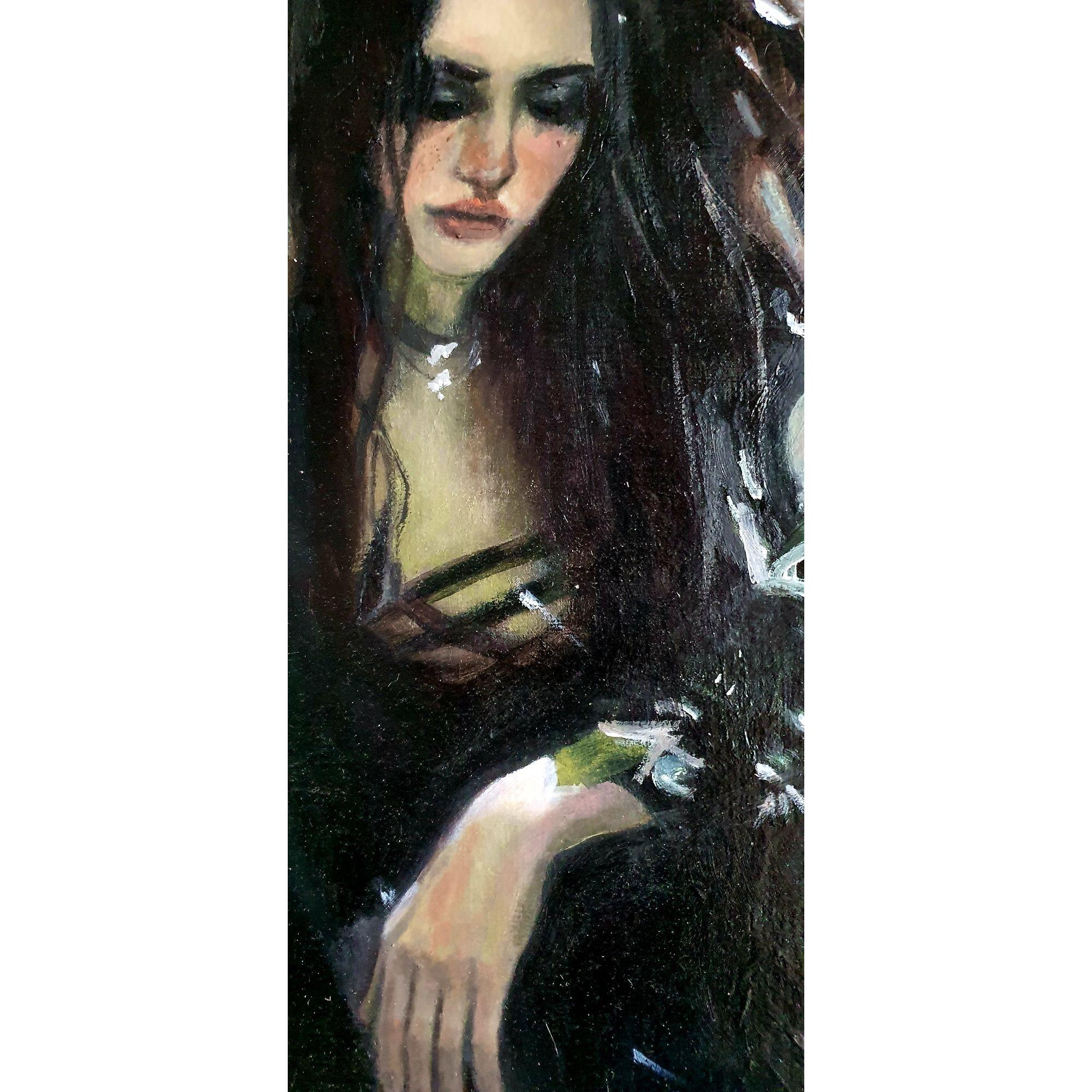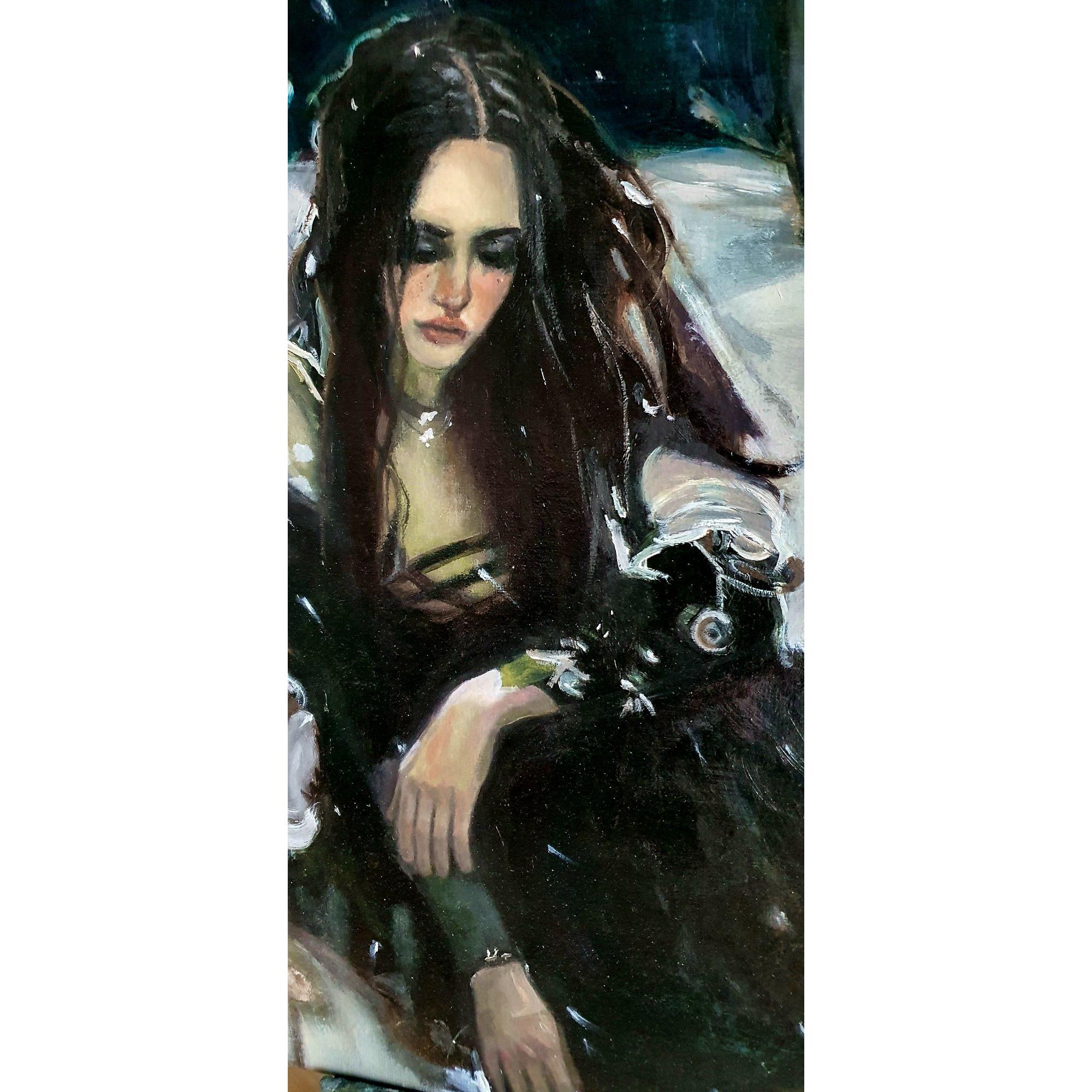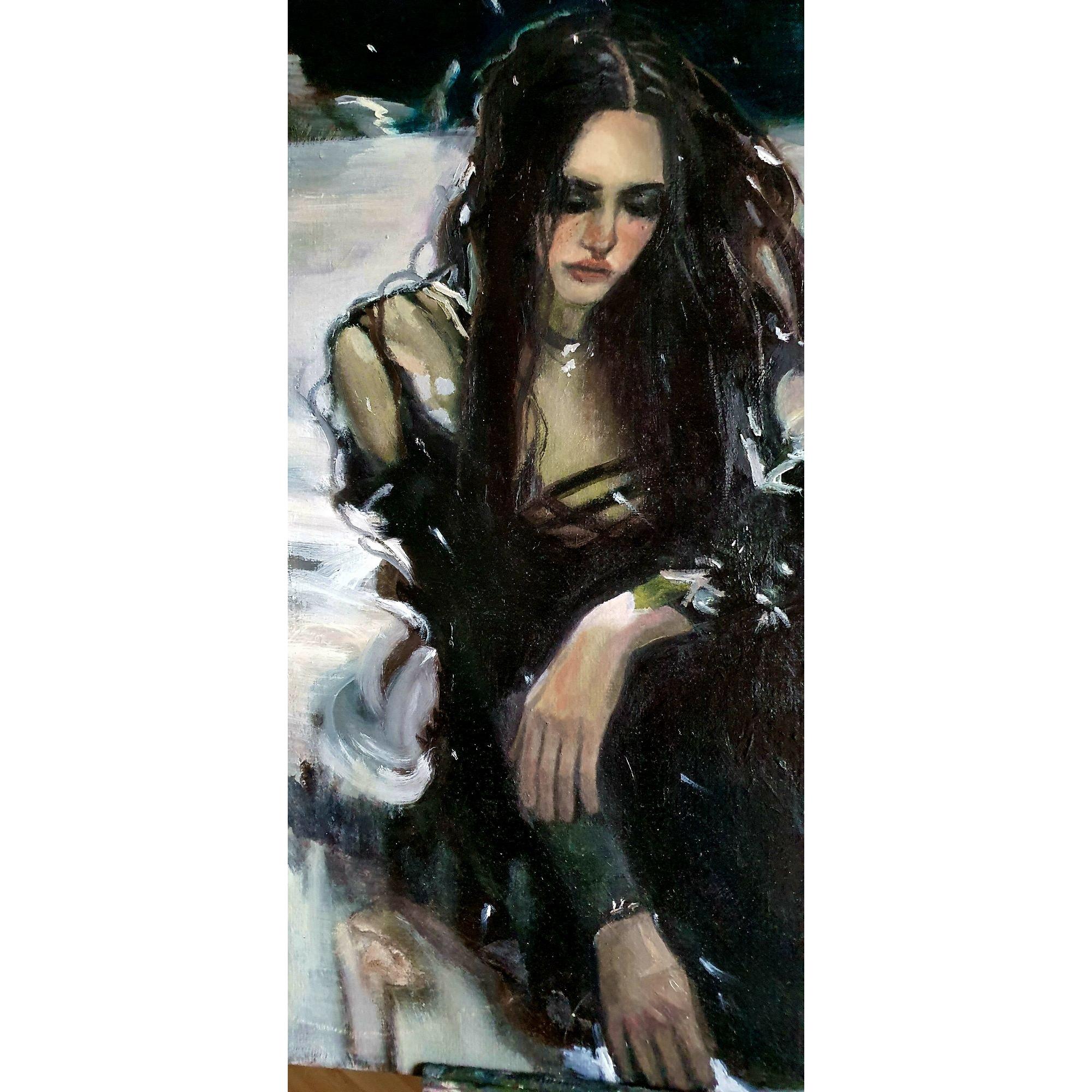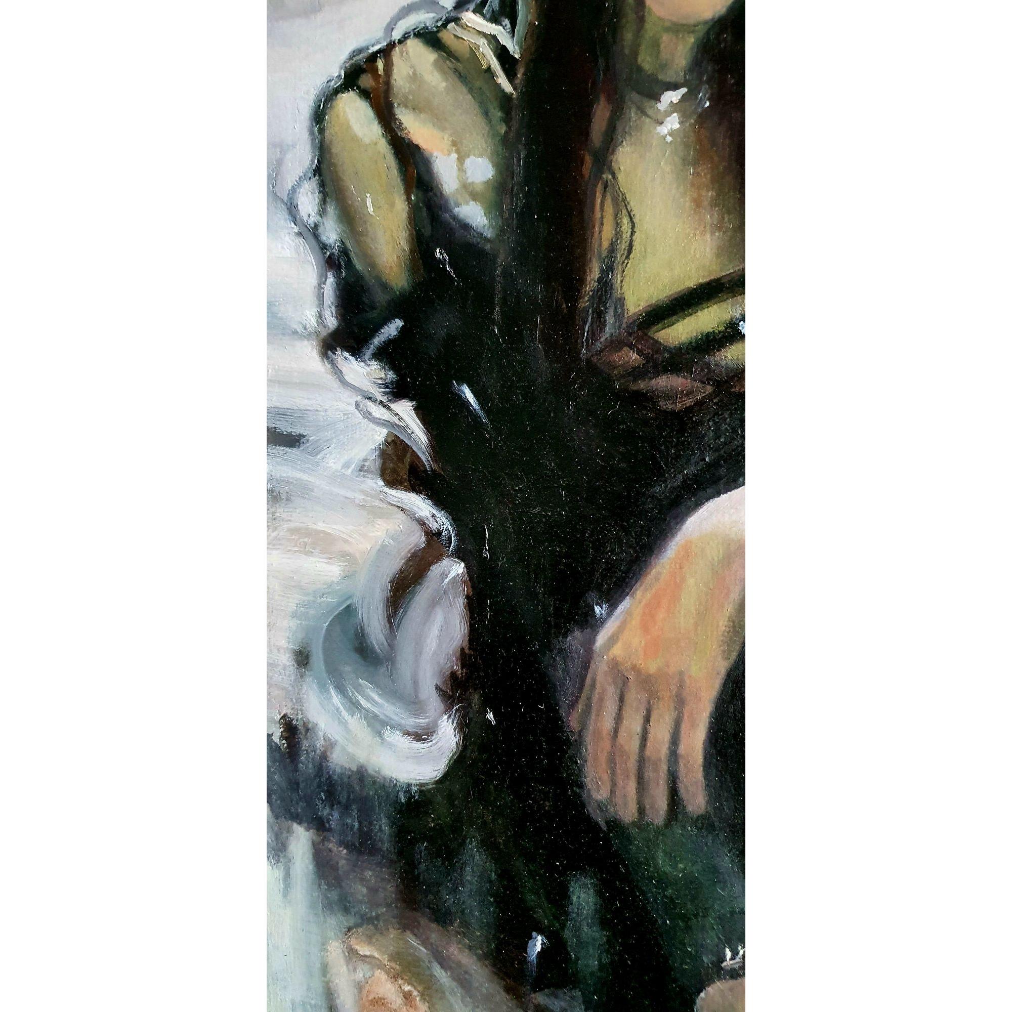 Nel mio lavoro torno spesso a quel punto fragile in cui la figura si dissolve e resta soltanto l’emozione. La stagione del silenzio nasce da uno spazio interiore sospeso, dove il tempo si rarefà e ogni elemento perde definizione per diventare percezione.La figura femminile non è un ritratto, ma una soglia. Il suo sguardo abbassato, il corpo raccolto, parlano di una condizione trattenuta, intima, quasi in ascolto. Il paesaggio innevato non descrive un luogo reale: è uno spazio mentale, un vuoto silenzioso che accoglie e amplifica la presenza.Il vestito, scuro e fluido, si espande fino a confondersi con l’ambiente, diventando esso stesso materia emotiva. Non è solo un elemento formale, ma una prosecuzione del corpo, una zona d’ombra che avvolge e protegge, ma allo stesso tempo assorbe. Mi interessa quel momento in cui figura e contesto smettono di essere separati.La pittura resta aperta, vibrante, volutamente instabile. Lascio che il gesto emerga, che alcune parti rimangano sospese tra apparizione e dissolvenza. La finitura a cera fredda interviene proprio qui: opacizza la superficie, trattiene la luce, crea una pelle pittorica vellutata e profonda, che invita a uno sguardo ravvicinato.Questo lavoro non cerca una narrazione, ma una condizione. È un invito al silenzio come spazio pieno, denso, in cui l’immagine non si impone ma si rivela lentamente.