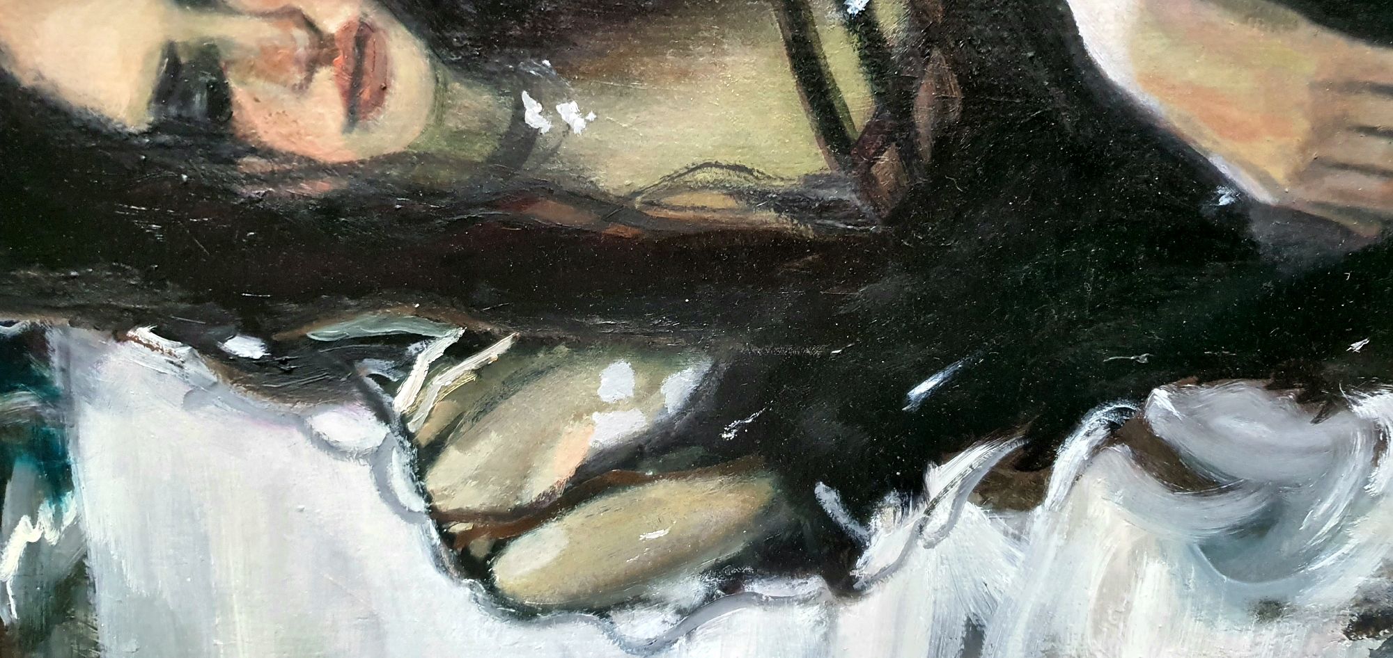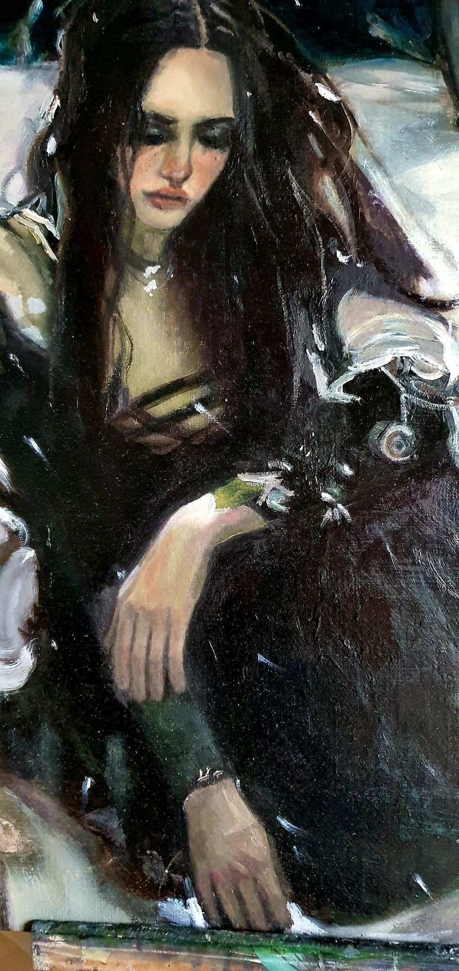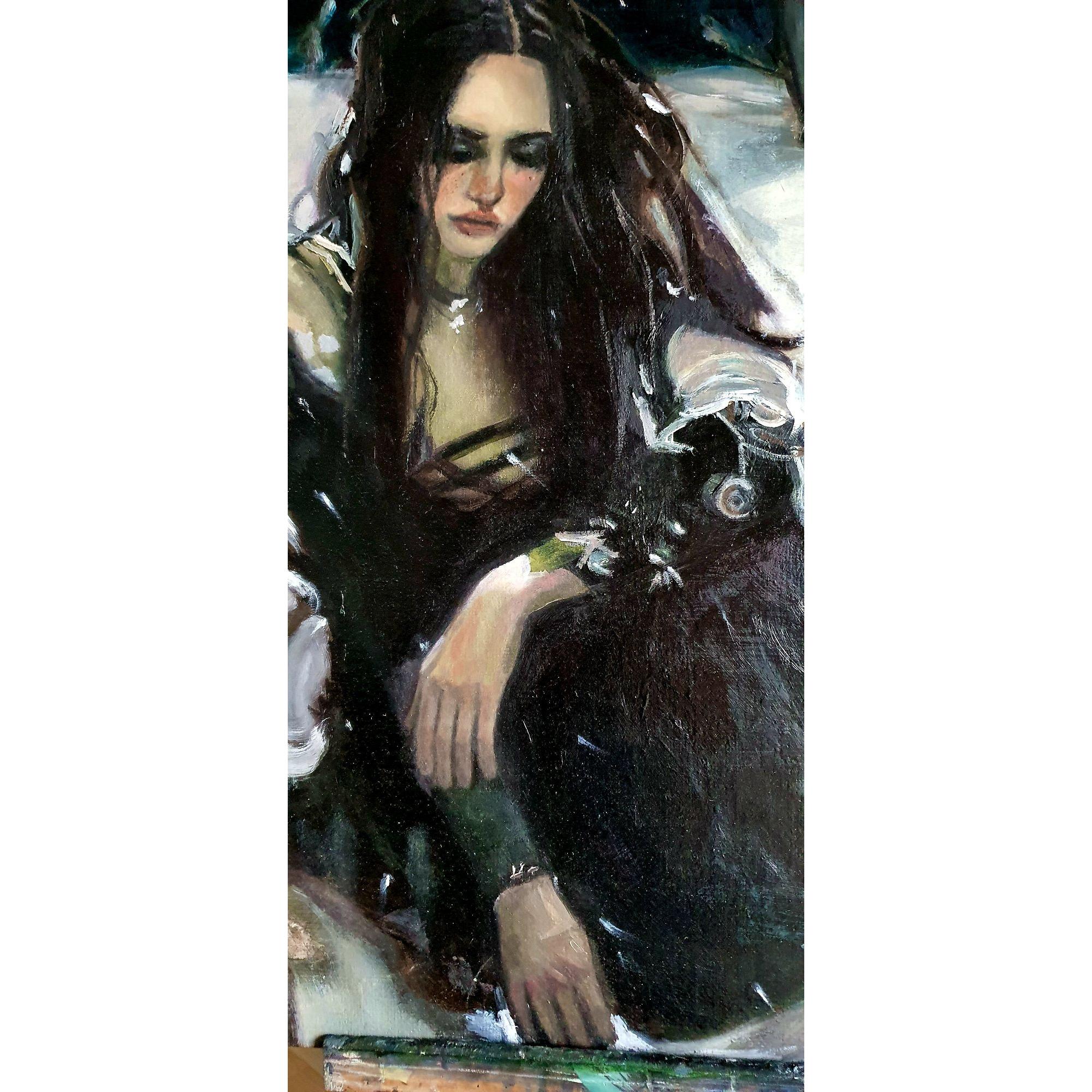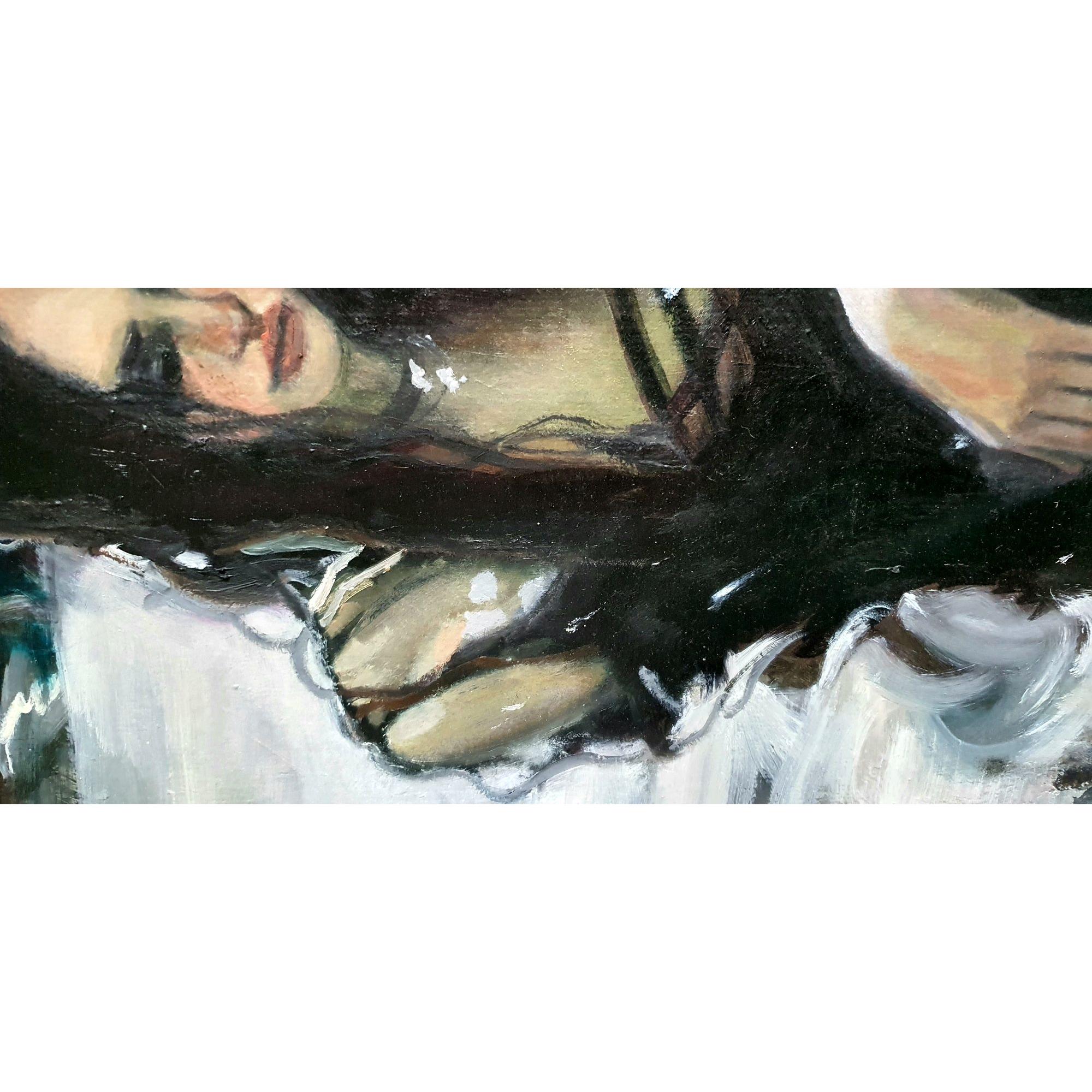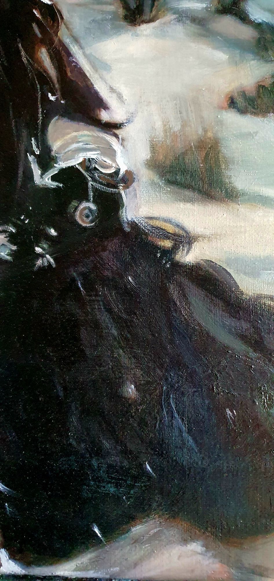 Nel mio lavoro torno spesso a quel punto fragile in cui la figura si dissolve e resta soltanto l’emozione. La stagione del silenzio nasce da uno spazio interiore sospeso, dove il tempo si rarefà e ogni elemento perde definizione per diventare percezione.La figura femminile non è un ritratto, ma una soglia. Il suo sguardo abbassato, il corpo raccolto, parlano di una condizione trattenuta, intima, quasi in ascolto. Il paesaggio innevato non descrive un luogo reale: è uno spazio mentale, un vuoto silenzioso che accoglie e amplifica la presenza.Il vestito, scuro e fluido, si espande fino a confondersi con l’ambiente, diventando esso stesso materia emotiva. Non è solo un elemento formale, ma una prosecuzione del corpo, una zona d’ombra che avvolge e protegge, ma allo stesso tempo assorbe. Mi interessa quel momento in cui figura e contesto smettono di essere separati.La pittura resta aperta, vibrante, volutamente instabile. Lascio che il gesto emerga, che alcune parti rimangano sospese tra apparizione e dissolvenza. La finitura a cera fredda interviene proprio qui: opacizza la superficie, trattiene la luce, crea una pelle pittorica vellutata e profonda, che invita a uno sguardo ravvicinato.Questo lavoro non cerca una narrazione, ma una condizione. È un invito al silenzio come spazio pieno, denso, in cui l’immagine non si impone ma si rivela lentamente.